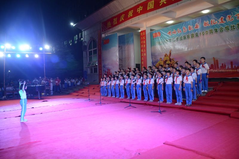 《没有共产党就没有新中国》歌声响起,合唱比赛正式拉开序幕。《彩色的中国》、《祖国,祖国,我们爱你》、《中国人民解放军军歌》、《八月桂花遍地开》、《我向祖国敬个礼》……各年级参赛的红色歌曲次第唱响,红旗舞动,歌声激昂,鼓舞人心,催人奋进。