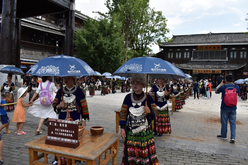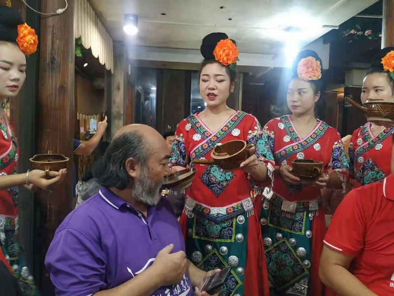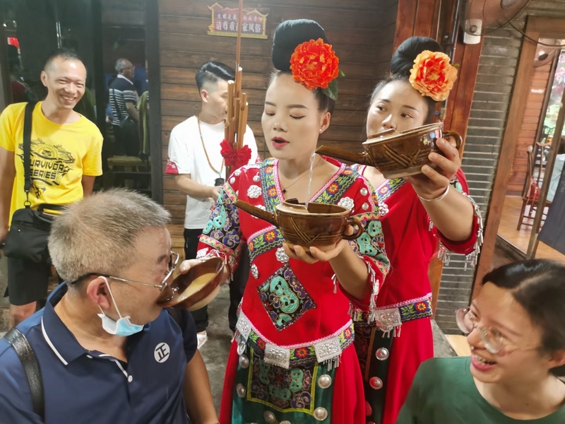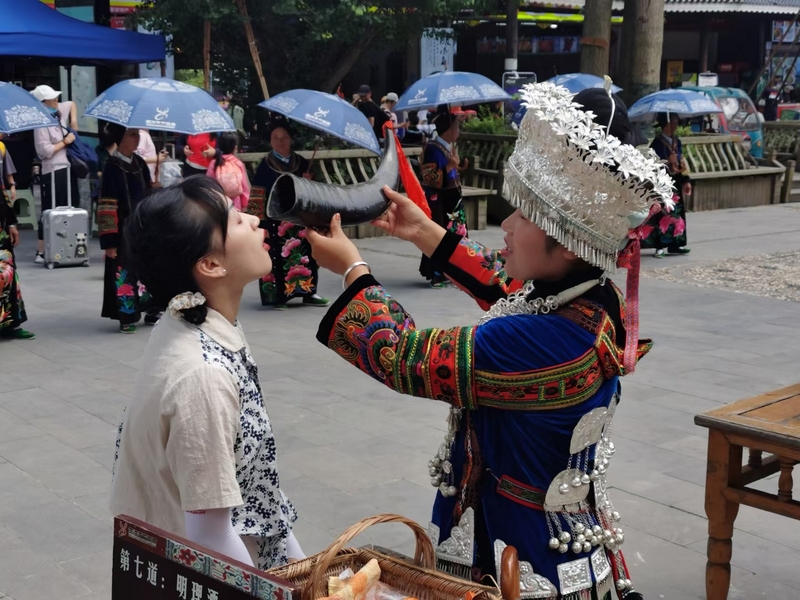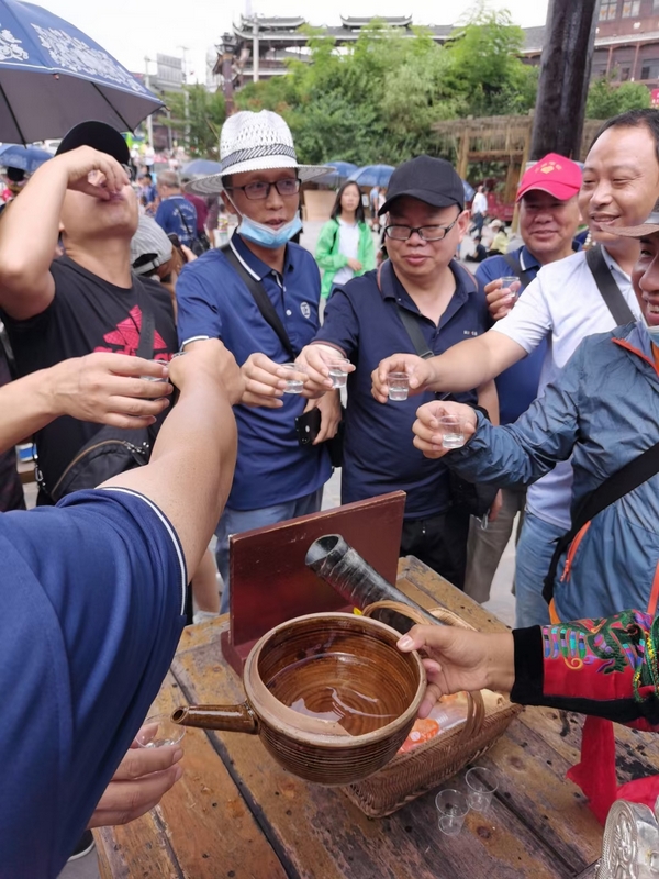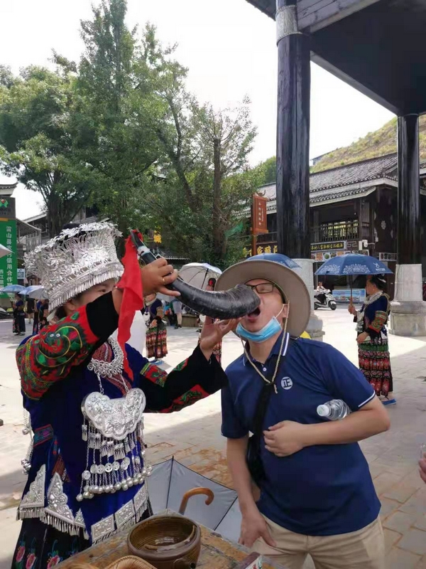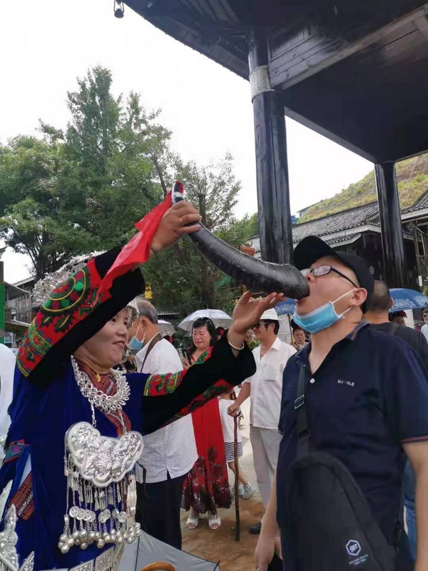 一下车,老师们就被眼前的阵仗所震撼:寨门前一字排开十二张桌子,身着盛装的苗胞们吹着芦笙,提着酒壶,给客人们递上自酿的“拦路酒”——恭喜酒、善良酒、勤劳酒、勇敢酒、聪明酒……每一道都寓意着吉祥美满,每一道都令人欲罢不能。