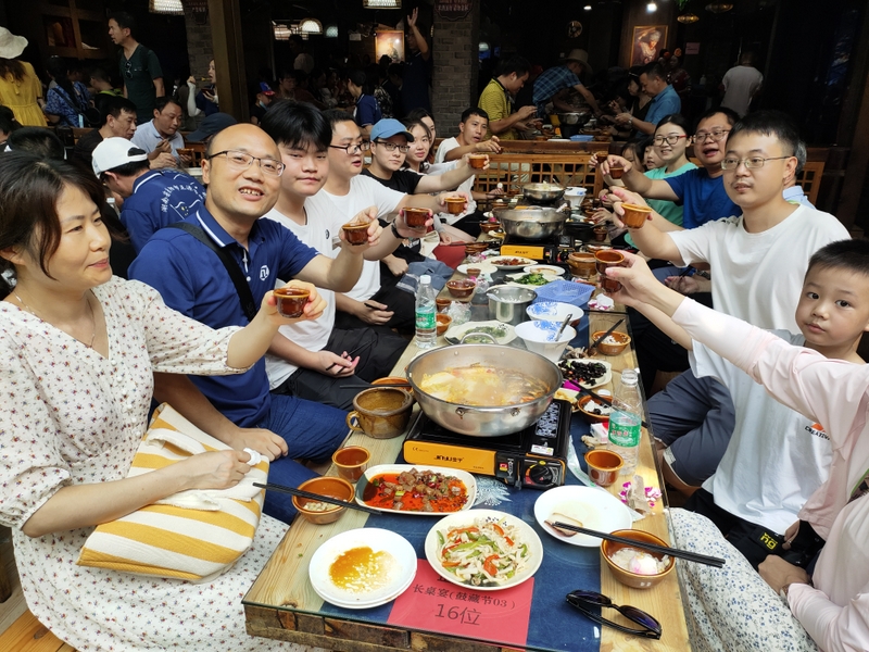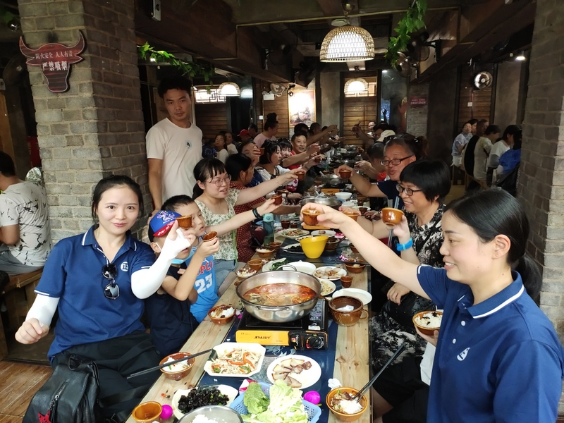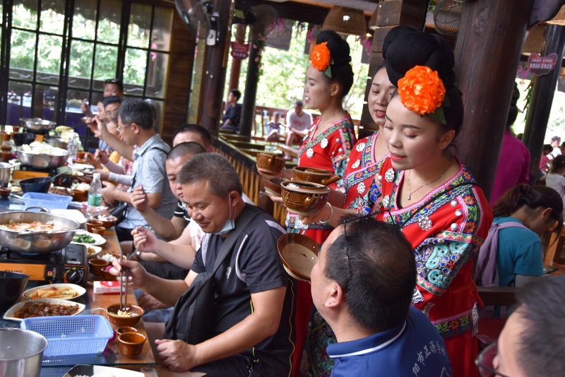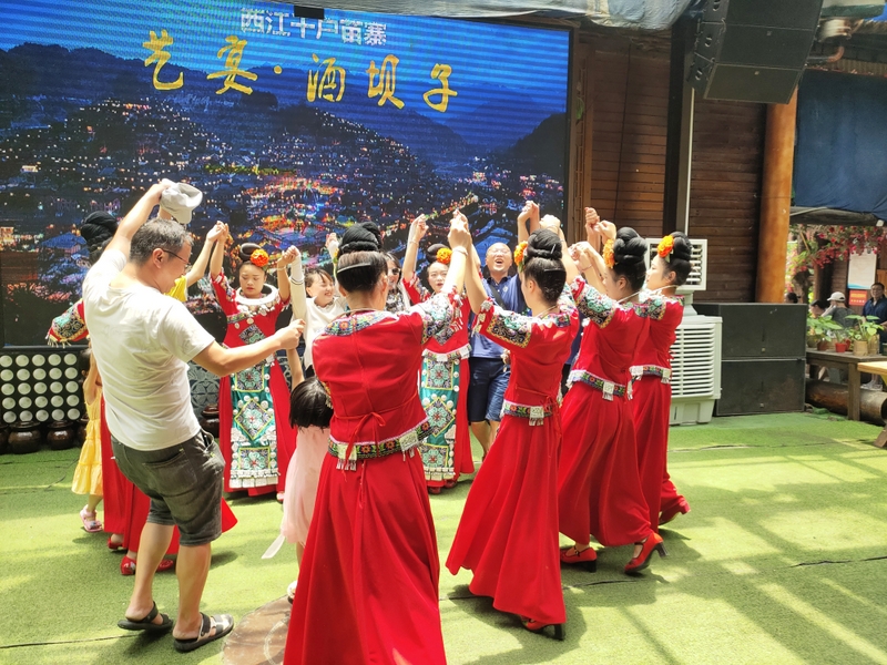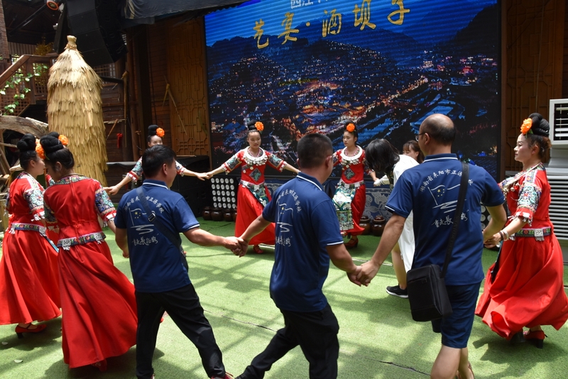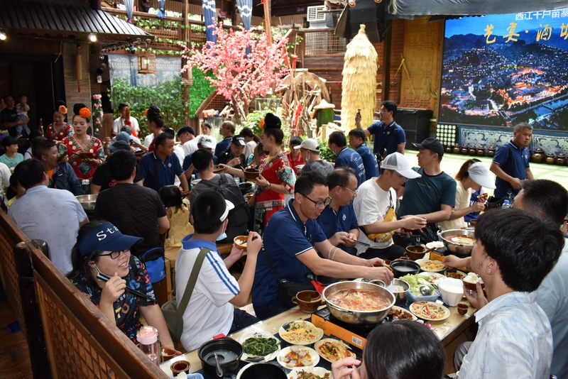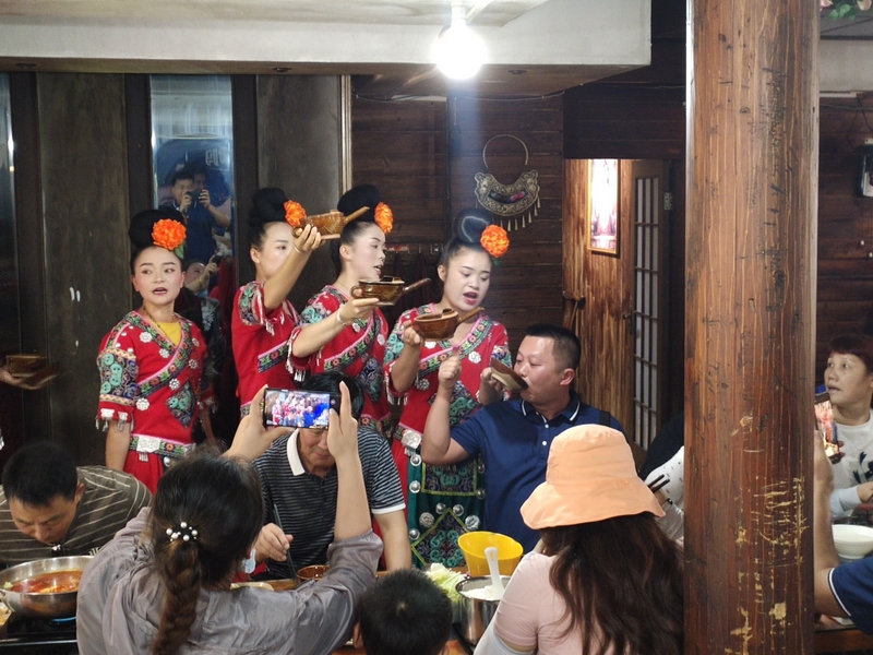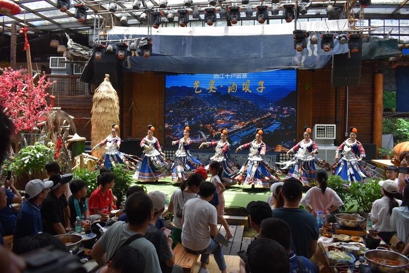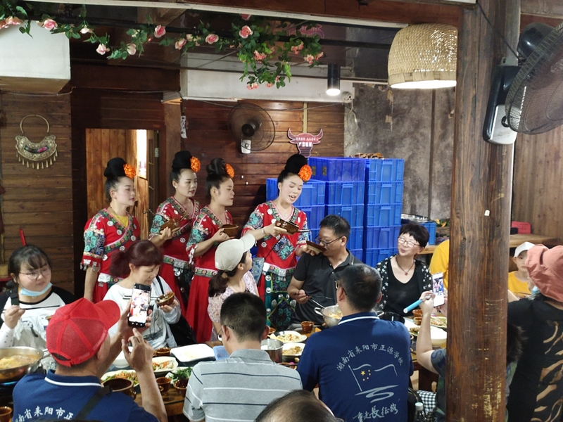 预订的长桌宴酒店苗胞已经在门口恭候多时,载歌载舞夹道欢迎正源团队300余人赴宴。热情漂亮的苗家姑娘在满满当当的长桌间梭巡敬酒,一片片敬酒歌唱响耳畔,一碗碗香米酒应声入口,一场场“高山流水”喝彩连连,热情洋溢的长桌宴热闹非凡。吃饱喝足,充满民族风情的苗族传统歌舞表演再次将宴会气氛推向高潮。