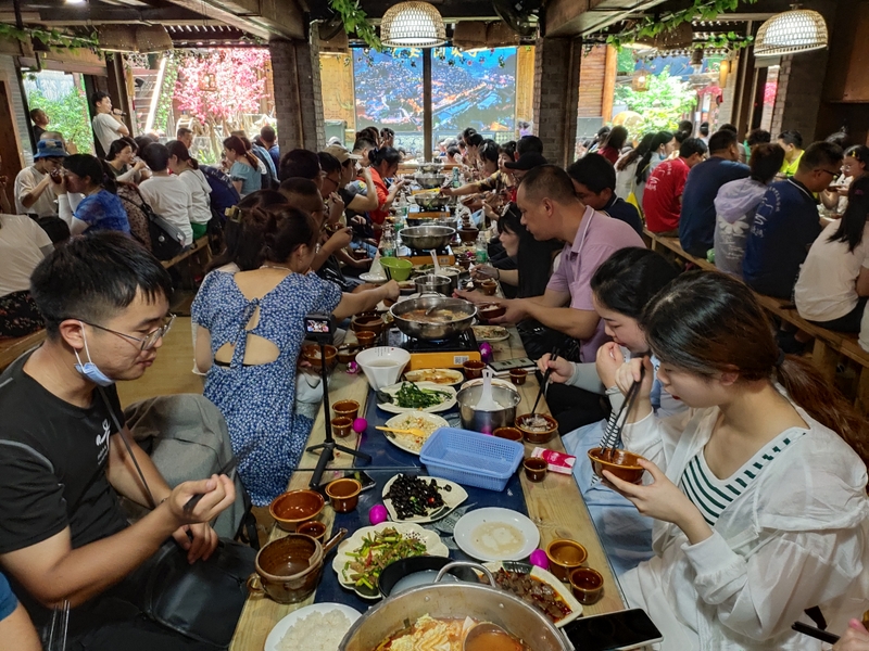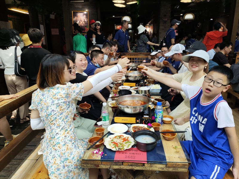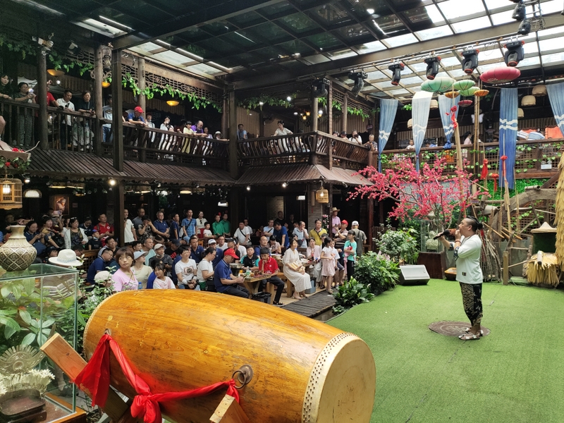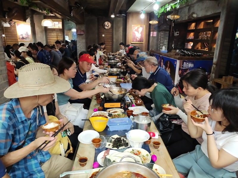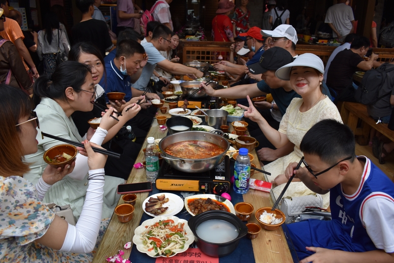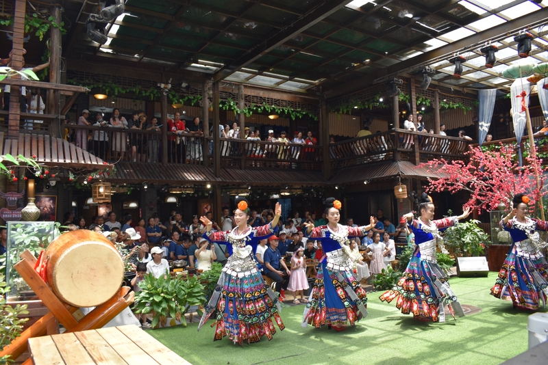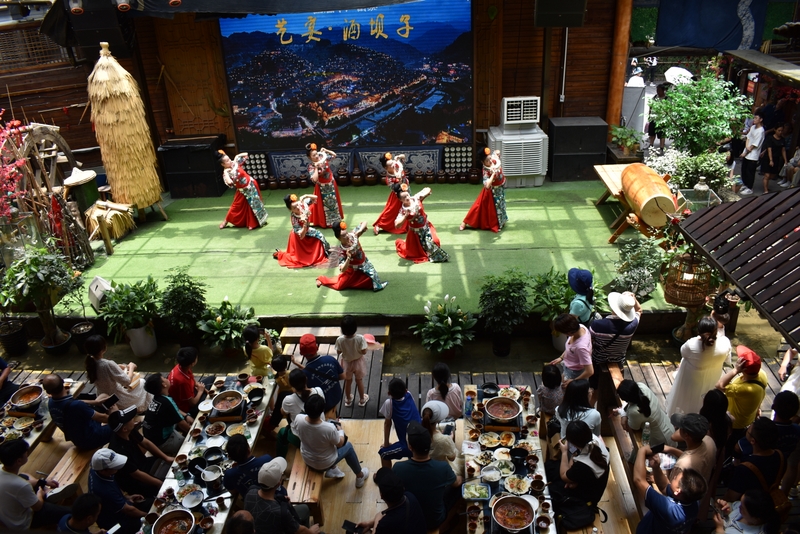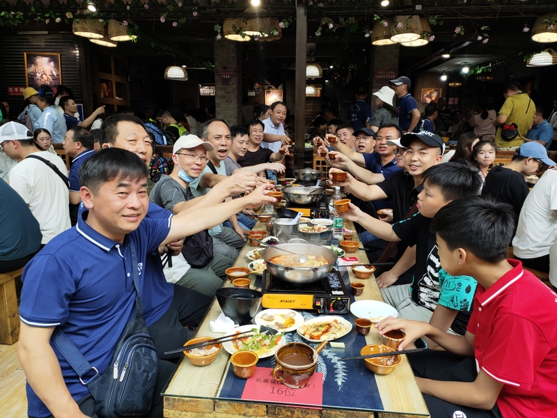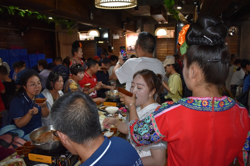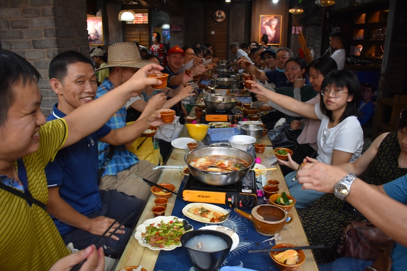 预订的长桌宴酒店苗胞已经在门口恭候多时,载歌载舞夹道欢迎正源团队300余人赴宴。热情漂亮的苗家姑娘在满满当当的长桌间梭巡敬酒,一片片敬酒歌唱响耳畔,一碗碗香米酒应声入口,一场场“高山流水”喝彩连连,热情洋溢的长桌宴热闹非凡。吃饱喝足,充满民族风情的苗族传统歌舞表演再次将宴会气氛推向高潮。