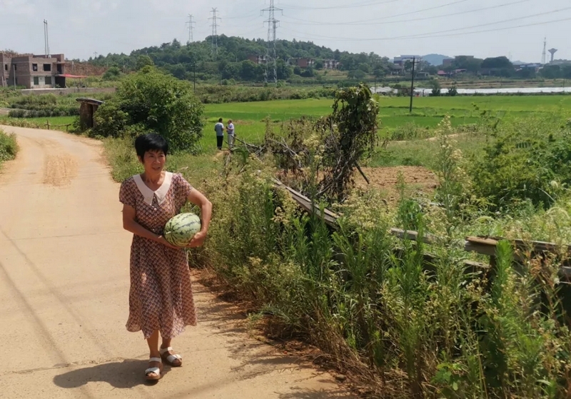 刘洋母亲资安珍从自家西瓜田里摘最大最甜的西瓜感谢罗校长一行