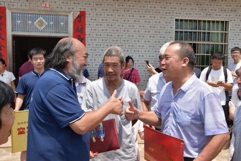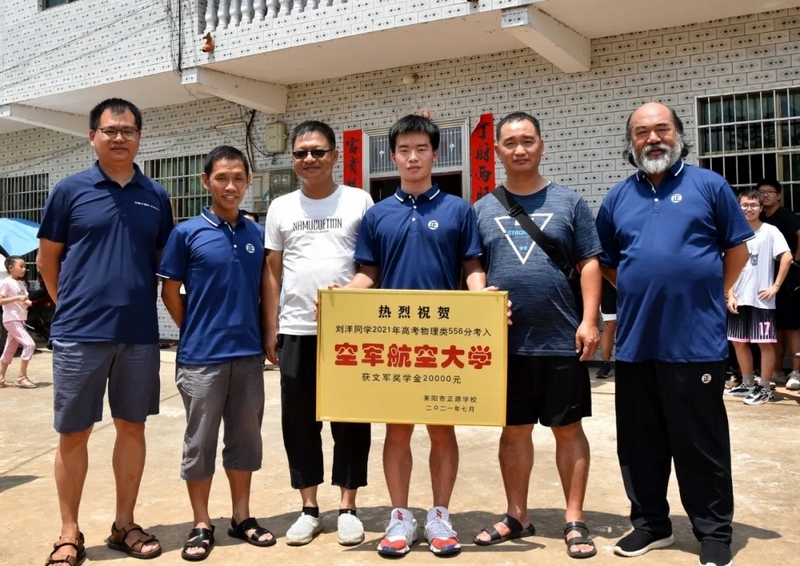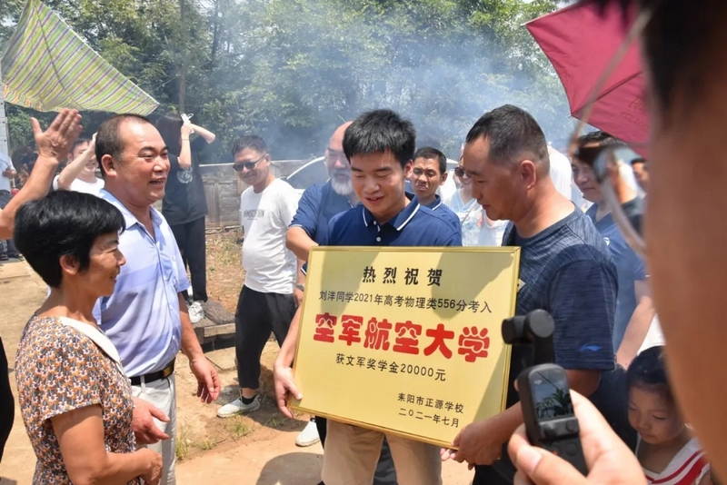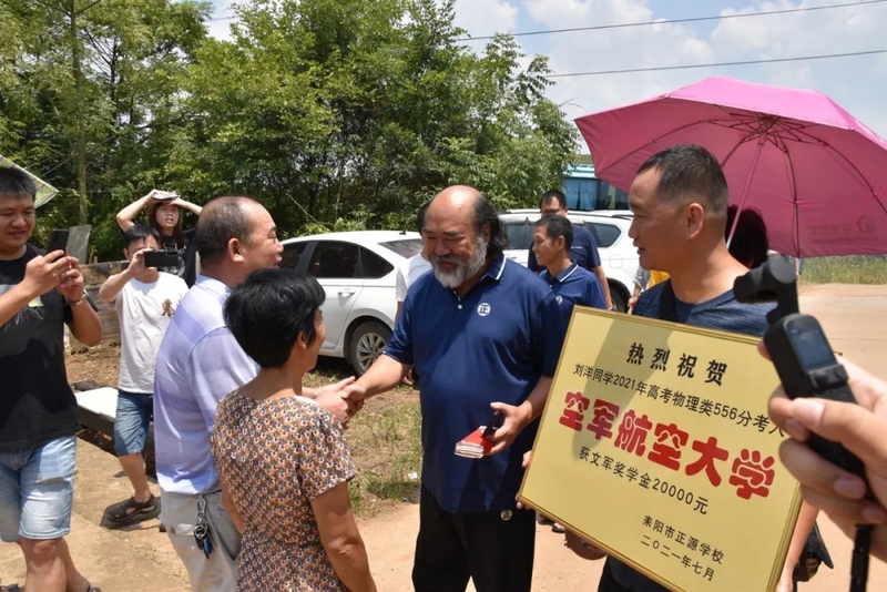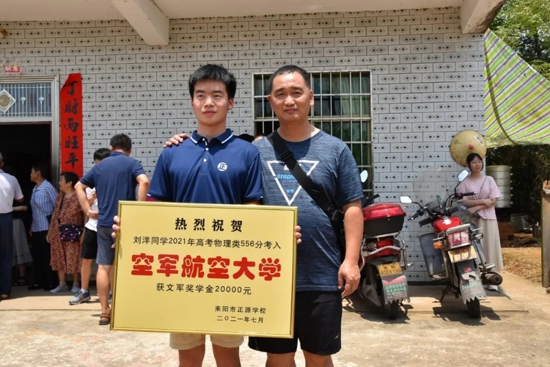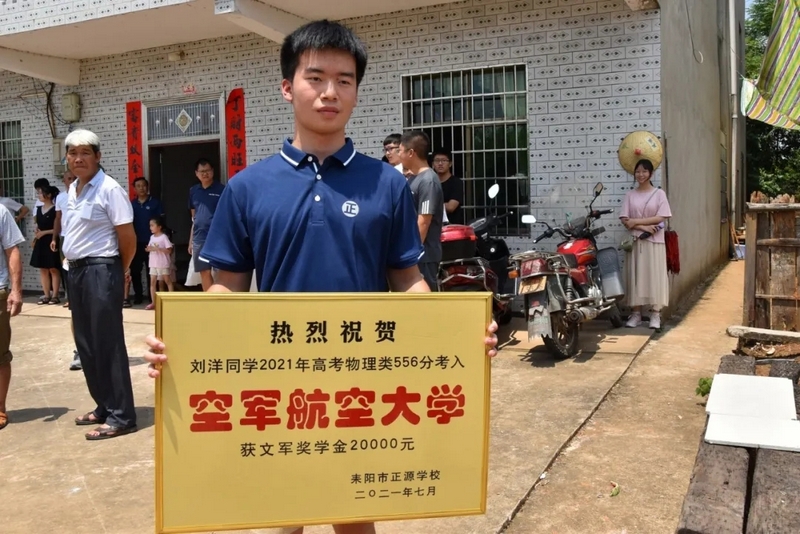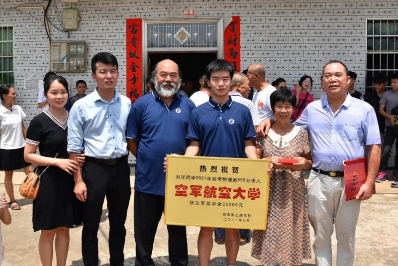 鞭炮声中,罗校长率领的贺喜车队到了。初中班主任肖常科、罗庚秋,高中班主任梁湘玉,年级主任曾晓晖,部分初高中任课老师,考上清华的徐轲娟,十多个刚拿到大学录取通知书的同学都来了。大家兴高采烈给刘洋家人送上金灿灿的贺喜牌匾,送上20000元文军奖学金,僻静的村庄喜气洋洋、热闹非凡。