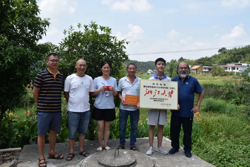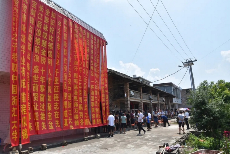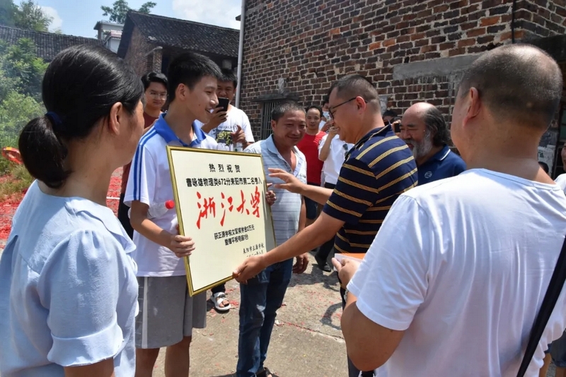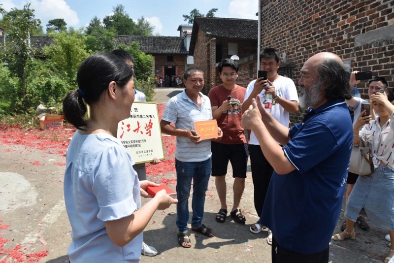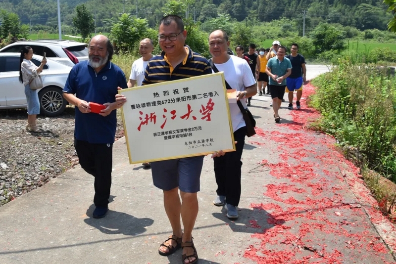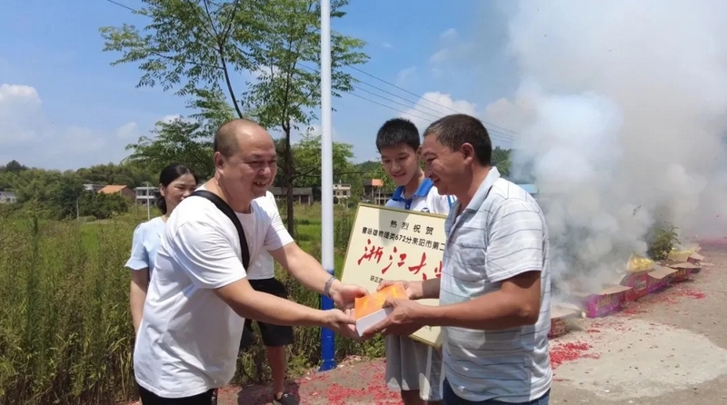 8月8日上午,正源学校的贺喜车队来到上架乡三江村曹家湾。震响四方的烟花礼炮声中,罗校长率队的初高中老师和同学们喜气洋洋地给曹家村的村民们来报喜了,金灿灿的贺喜牌匾、20000元文军奖学金、华为平板电脑接二连三交到曹咏雄父母手中,罗校长的祝福更是让大家羡慕不已——“曹咏雄,以后要当院士,要拿诺贝尔奖,科学报国!”