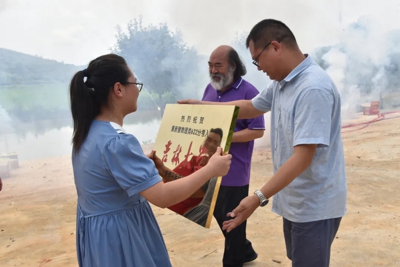 刚满月就放在家里留守的女儿,如今金榜题名考出622分的高分,成了全村交相夸赞的“才女”,黄含青夫妇更是喜出望外,今天特意双双穿上大红衣裳,要用这身喜庆吉祥的“女儿红”来迎接老师和亲朋。村口的烟花爆竹层层叠叠,点得热火朝天,响得震耳欲聋、气冲云霄。十八年的奔波,十八年的期盼,女儿能有今天,两口子简直不敢想像,太高兴了。