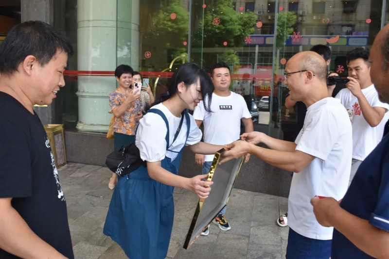 班主任陈国军给朱媛媛颁发贺喜铜牌
