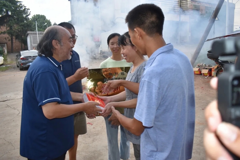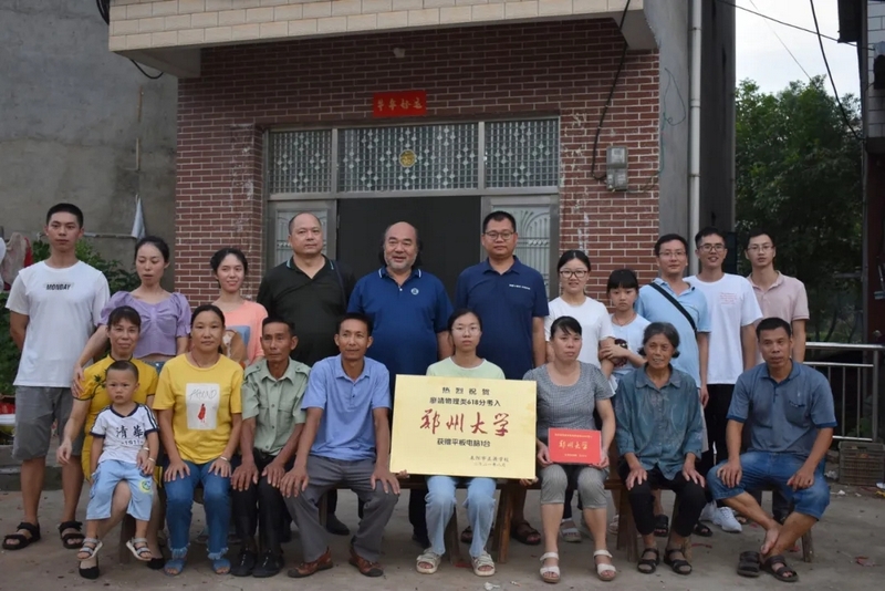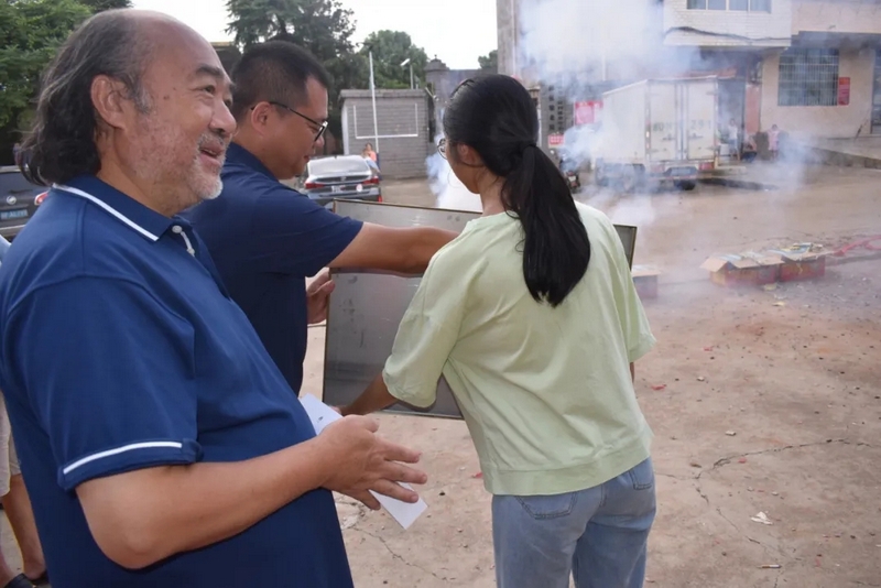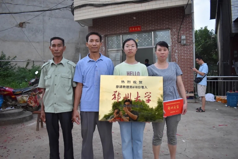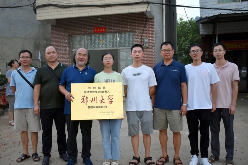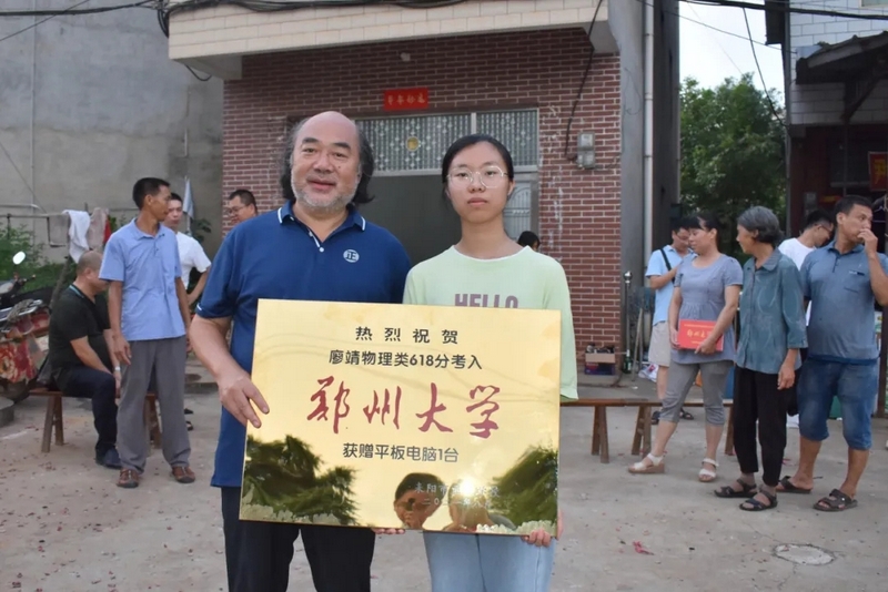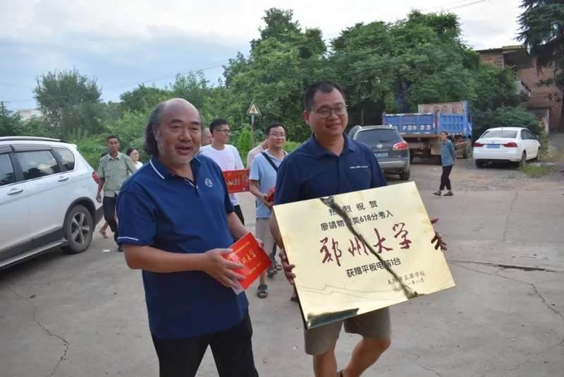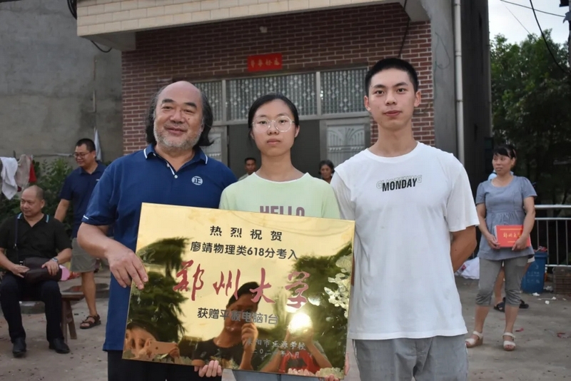 率队的罗校长给廖靖妈妈送上华为平板电脑,班主任曾晓辉老师把“618分考取郑州大学”恭贺铜牌交到廖靖手中,鞭炮轰鸣声中一派喜气洋洋。正待进屋,随队的德育主任王伟荣老师被人拍了一下肩,一转头,“徐裕旺!你怎么来啦!”王老师喜出望外的吼声炸雷般响起,只差没盖住耳畔噼里啪啦的鞭炮声。