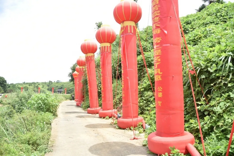 喜庆拱门气球条幅从冲口一直延伸到塘坝