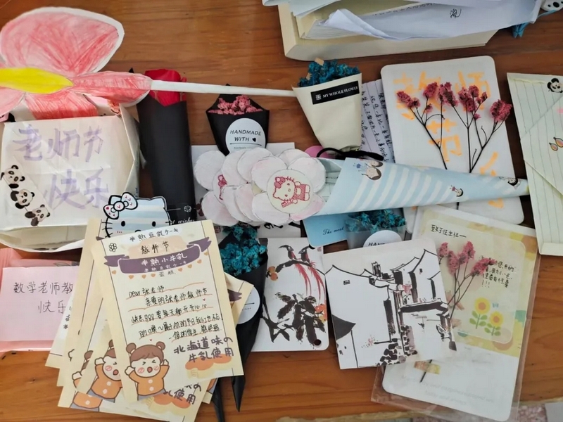 9月10日,上午第一节课,一阵阵清脆欢快的“老师节日快乐!”在一间间教室响起,一份份别致的小礼物、别出心裁的小卡片、小纸条在办公室里传送。教师的节日,同学们比老师还兴奋,还高兴。