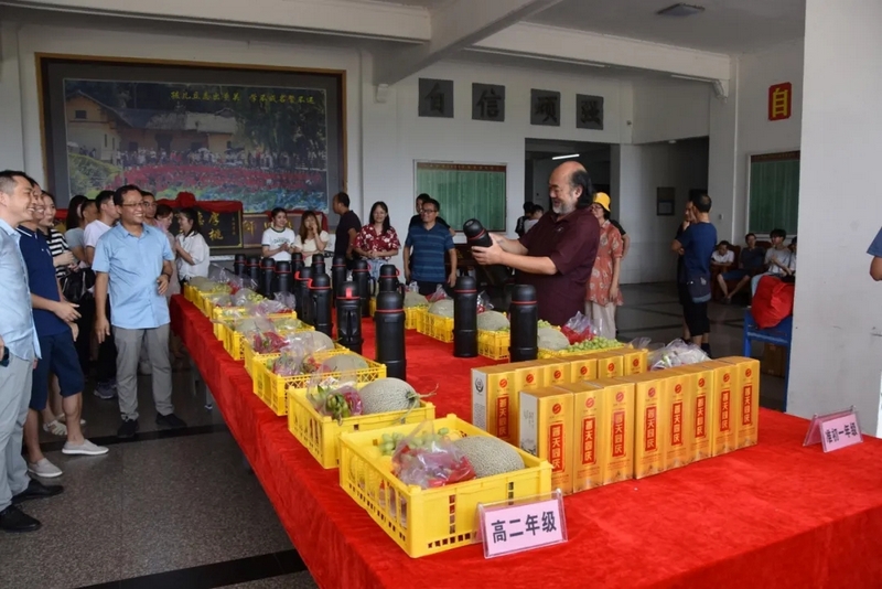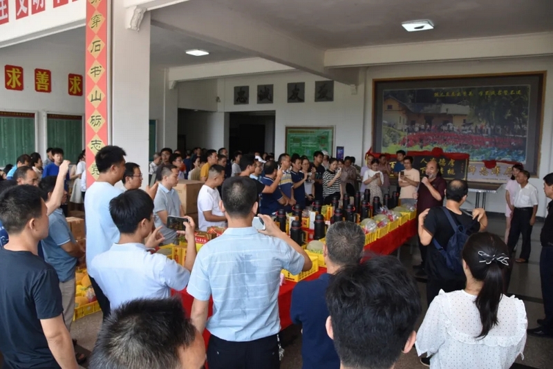教学楼大厅内,“孩儿立志出乡关 学不成名誓不还”画幅前,长桌、红毯、果篮、茅台、礼品、礼金已分年级摆好,熙熙攘攘、如山如海。