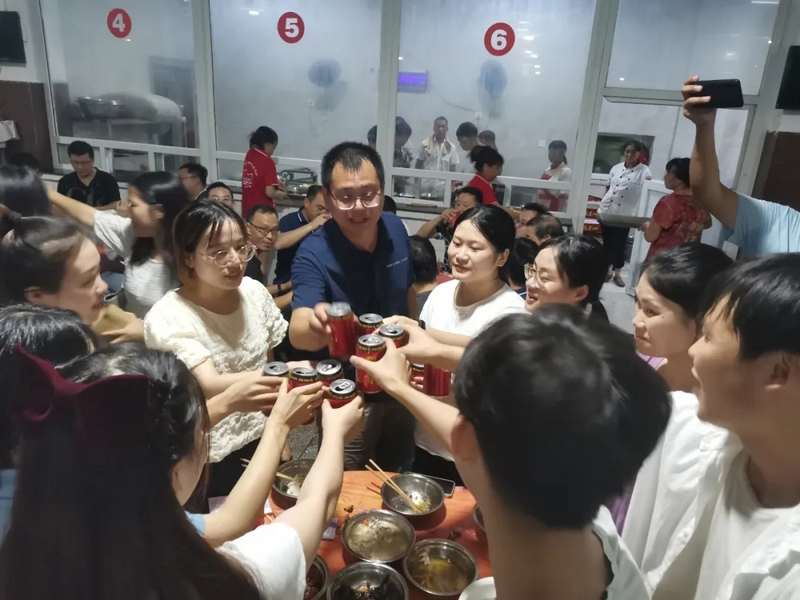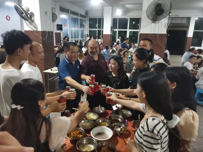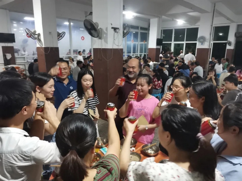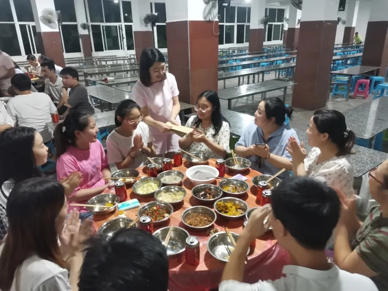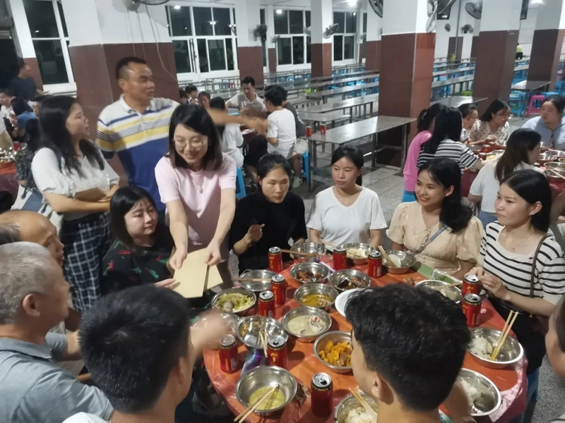 晚上7点,食堂已经备好16桌菜肴,迎新聚餐活动在三食堂西餐厅举行。上学期、本学期新进136位新老师齐聚一堂,和罗校长、校党支部书记毛小波、各年级负责人一起举杯共庆,欢度教师节。