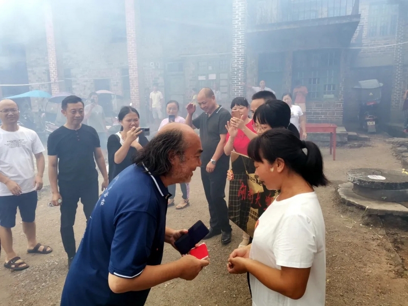 罗校长给张桂娟母亲刘洪英颁发文军奖学金10000元