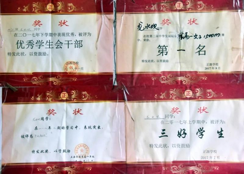 但是进到家里,整墙的奖状中,属于龙水欢的并不多,多数都是她两个弟弟的奖状。一问才知道,懂事的龙水欢只是把自己的奖状拿来给弟弟们做个榜样,“多了就没贴了,主要给弟妹们腾点位置放奖状。”