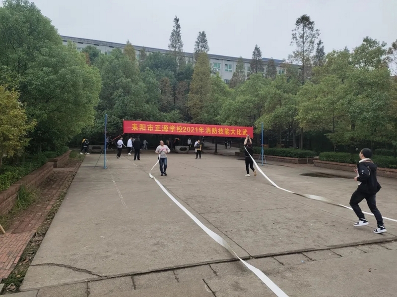 消防水池前的篮球场上,36个学校专业消防员正在激烈角逐,赛事如火如荼。这是正源学校2021年消防技能大比武。