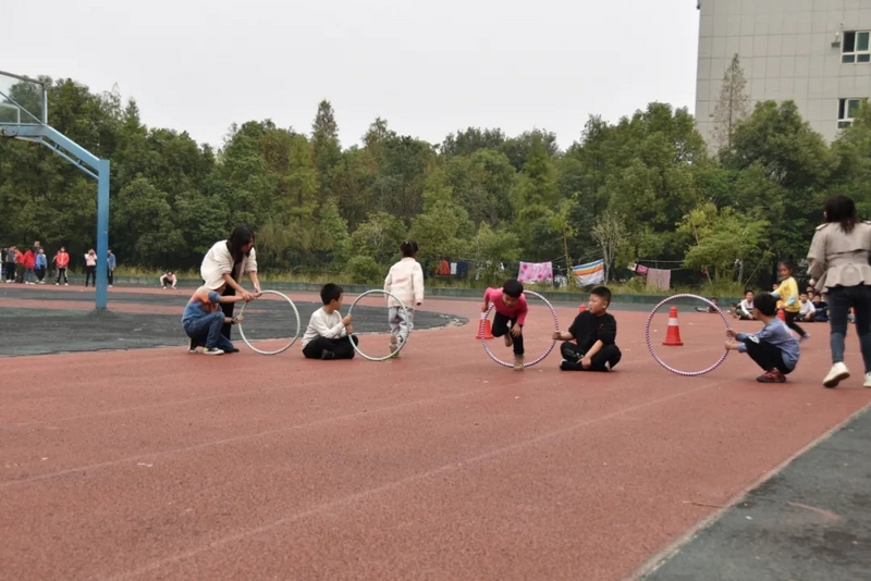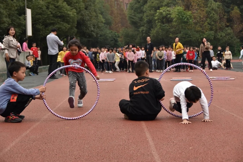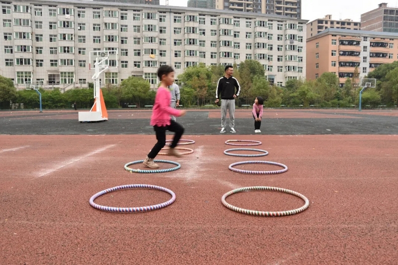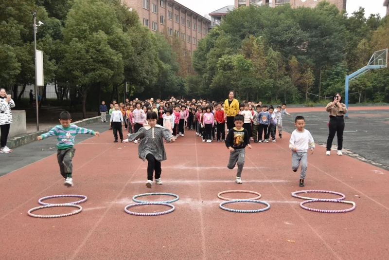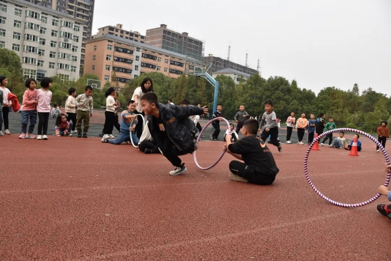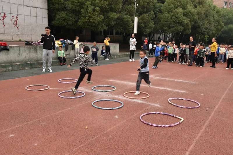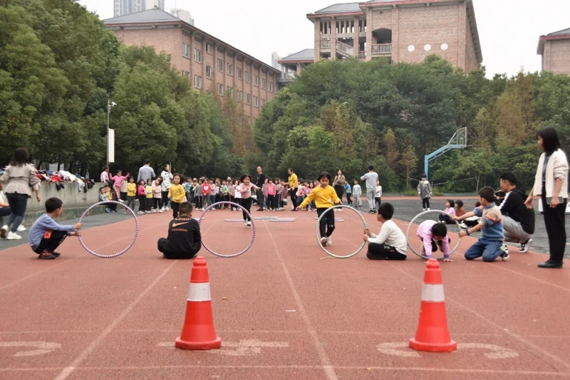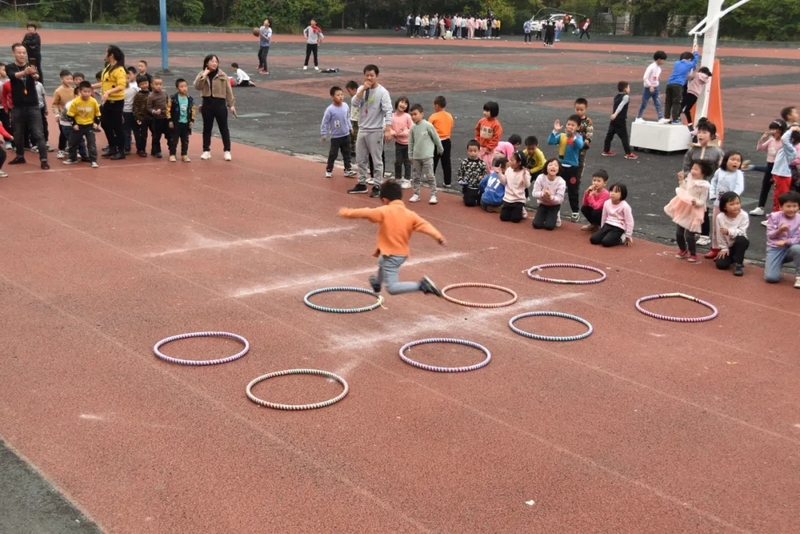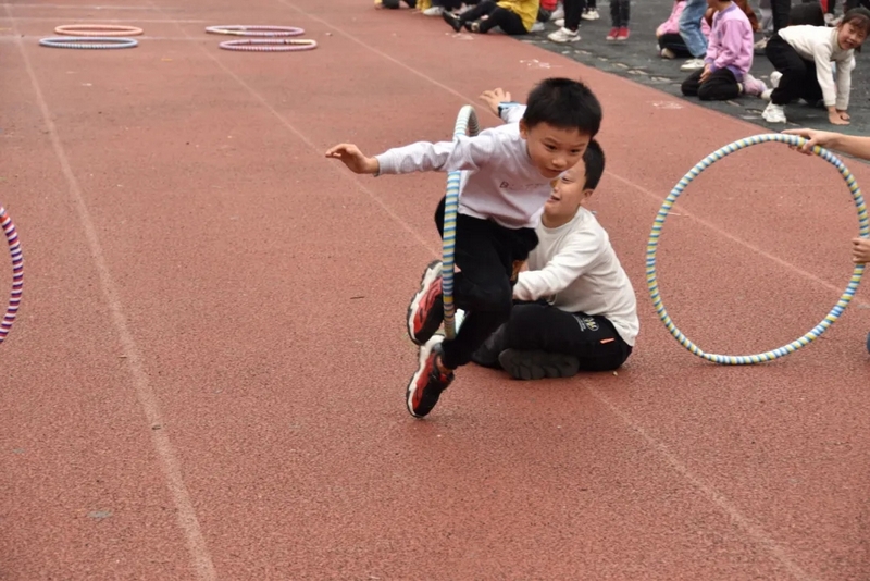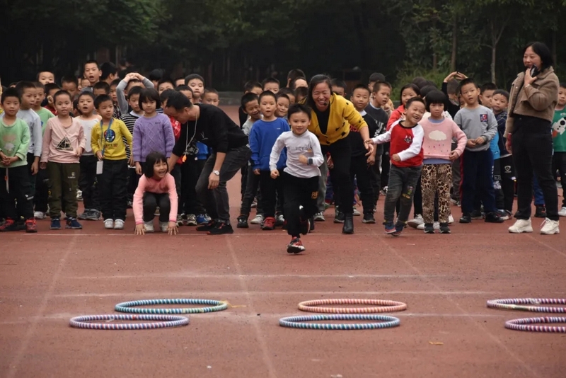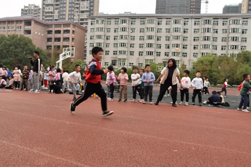 小朋友们都跃跃欲试。在班主任的组织下 ,一年级的176名同学,按照班级分成四队,女同学在前面,男同学在后面 。只听一声口哨响,第一位同学像箭一样冲出去 ,双脚跳过呼啦圈,以矫健的身姿钻过呼啦圈,绕过障碍物,再回到了起点,与下一同学击掌进行接力 。突然,421班的曾子怡同学哭泣起来,原来她特别害怕,不敢跑。在老师的引导和同学的鼓励下,曾子怡同学勇敢的跑了出去。
