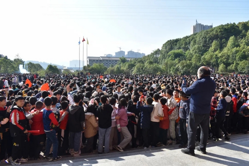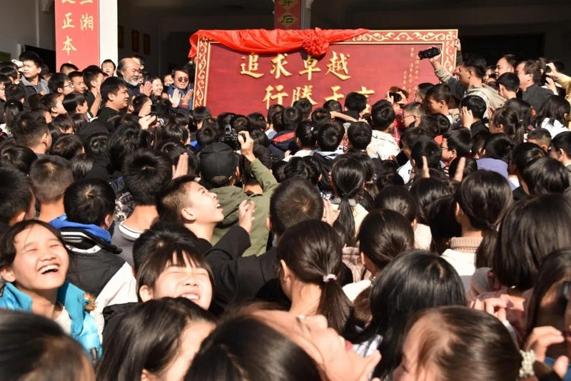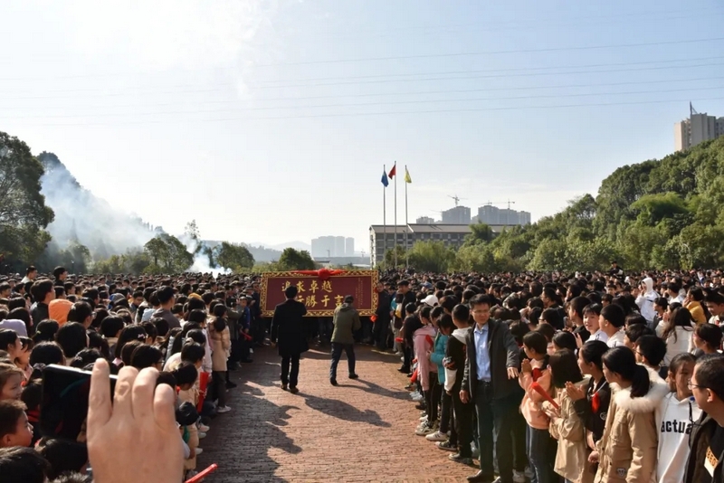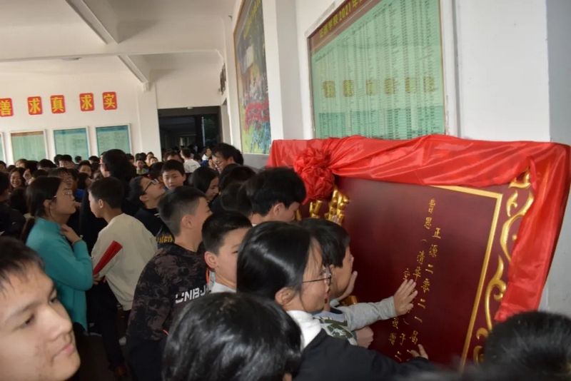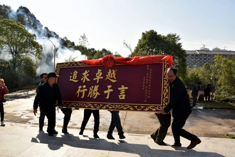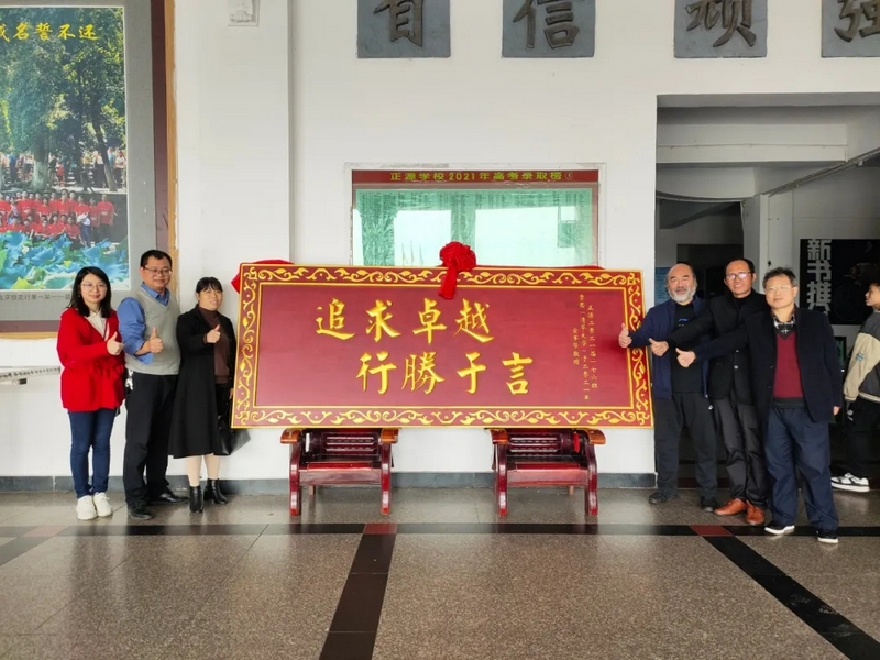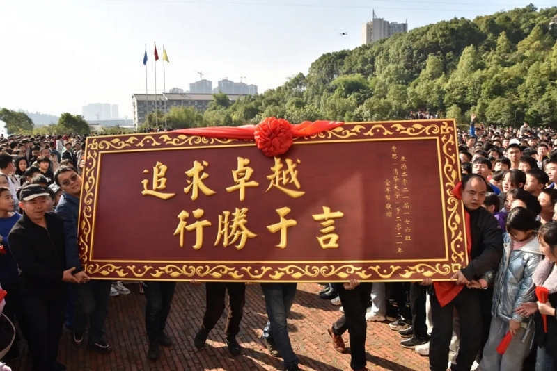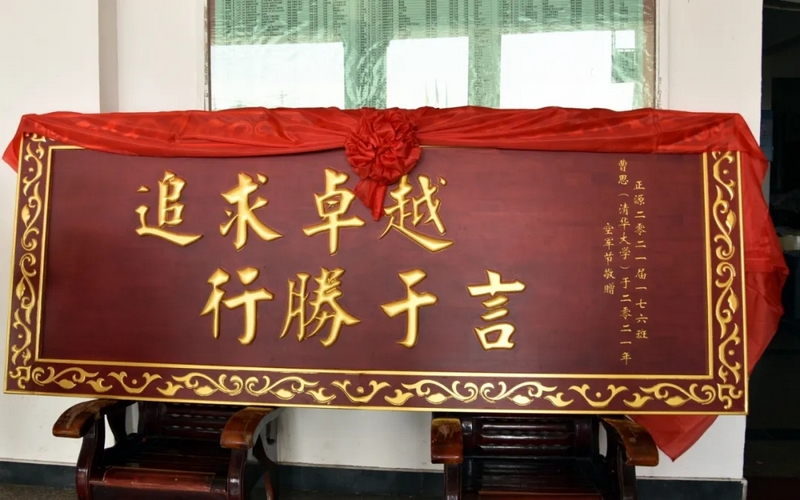 2021年高考,正源曹思、罗湘毅、刘洋三位学哥学姐考取空军航空大学飞行员,其中曹思学姐作为耒阳市有史以来第一位女空军飞行员,又以优异的成绩和出类拔萃的综合素质,过五关斩六将,晋身清华大学飞行员班双学籍学员,与2020届空军航空大学飞行学员姚剑学长团聚清华校园。几位空军飞行员学长学姐的励志故事,同学们在学校公众号里看过,在学校正报上读过,在正源电视台视频直播里学过,耳熟能详,引以为豪,是大家敬仰的偶像、学习的榜样。“双十一,空军建军节,这个特殊的日子,曹思的父母来到了我们正源学校!”曹思父母携8名亲友,抬着300斤重的曹思赠给母校的牌匾来到了广场国旗下。万余名正源学子朝着罗校长挥臂所向之处踮脚眺望,掌声、欢呼声、鞭炮声响彻云霄。8人抬动的实木牌匾缓缓转身,朝向广场万人,“追求卓越,行胜于言”8个鎏金大字在艳阳下熠熠生辉,现场沸腾起来。“追求卓越”是空军的军训,“行胜于言”是清华的校训。曹思赠给母校的赠言,是万千正源学子孜孜以求的奋斗目标,也是万千正源学弟学妹见贤思齐的榜样,更是对正源母校的殷切期望。