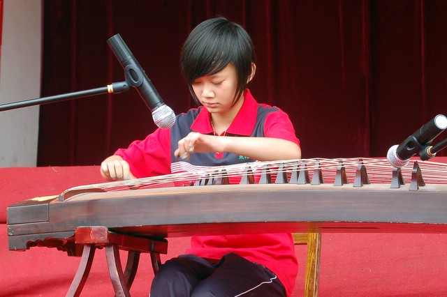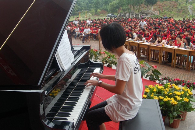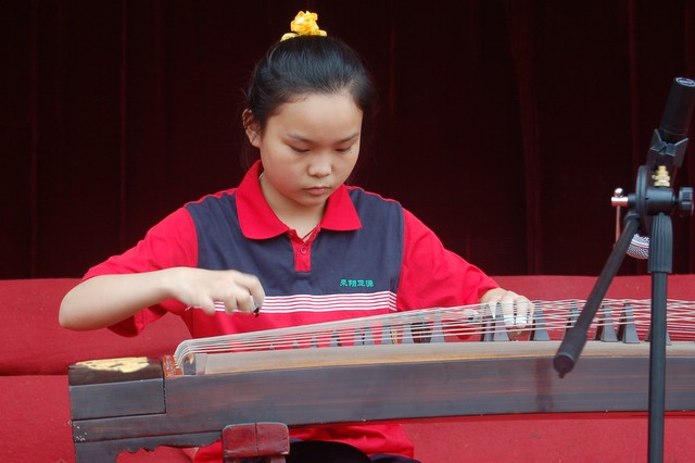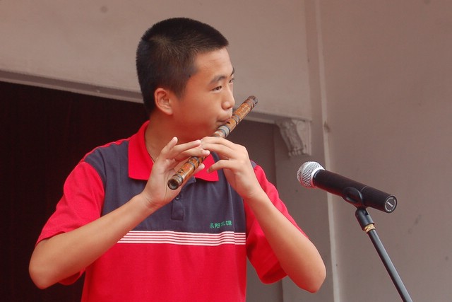 歌唱结束,有的学生还走上舞台演奏了钢琴、古筝、笛子等,展示才艺。