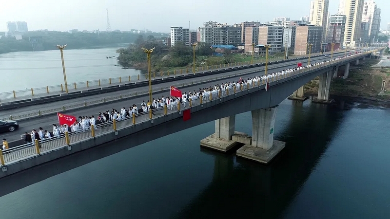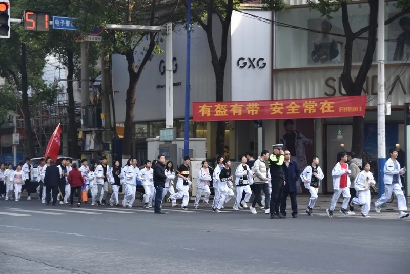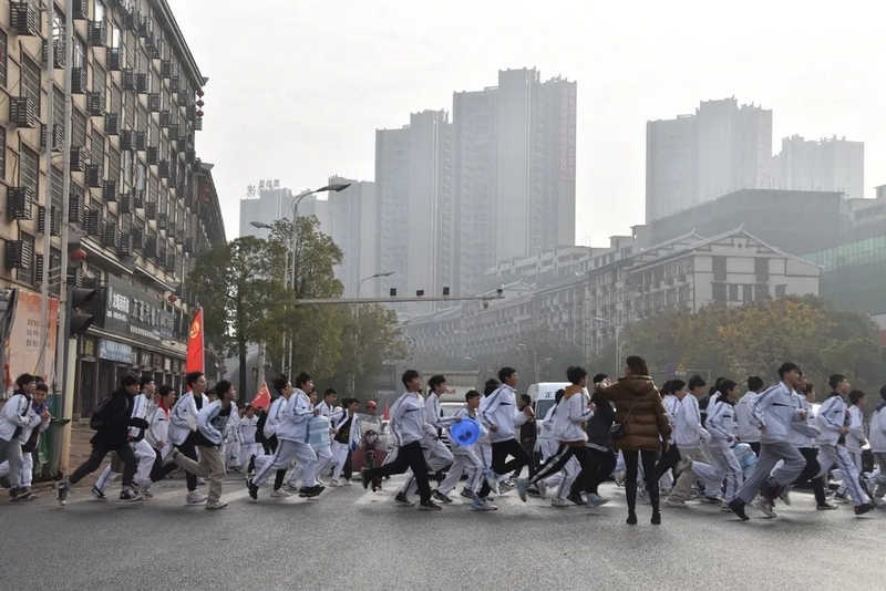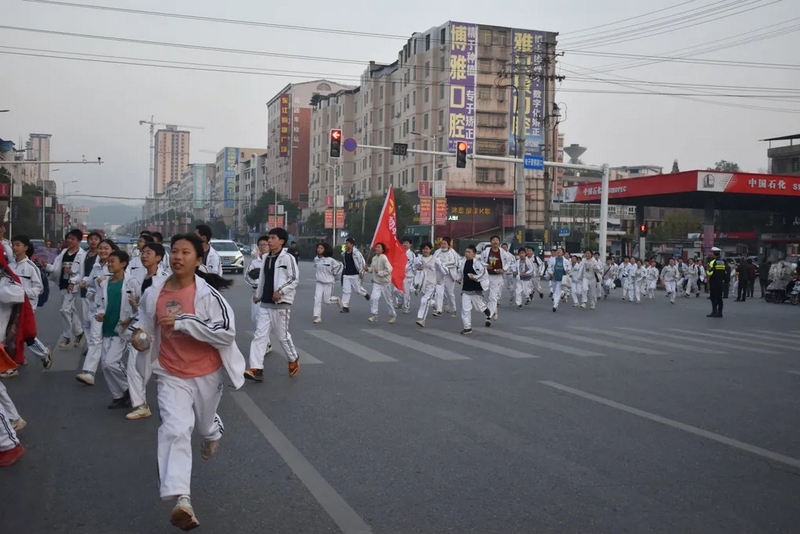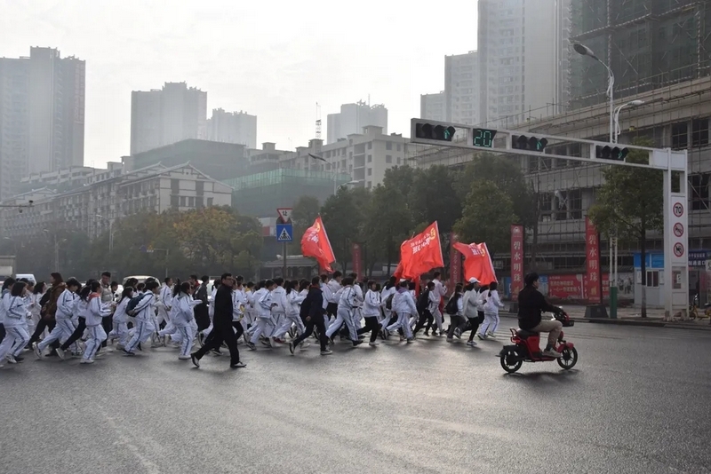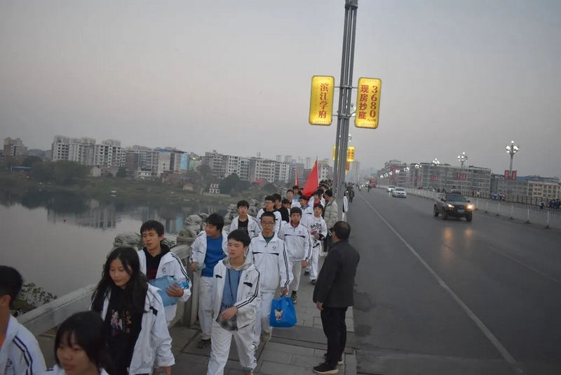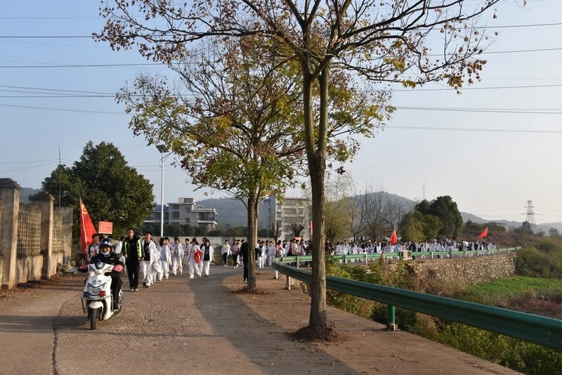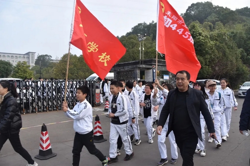 天公作美,13日还是寒风细雨,14日便阳光明媚。8点28分,初二全体师生踏着晨曦,迎着朝阳,带着青春的笑容和无畏,迈着整齐的步伐踏上了励志远足之旅。红旗飘扬,步伐坚定。远离了课本和作业,同学们贪婪的享受外出的自由。同学们在老师的陪伴下,有说有笑,斗志昂扬,胜似闲庭信步。以班级为单位,穿过鳞次栉比的高楼和车水马龙的大街,无疑,全体师生成为了耒阳街上一道最靓丽的风景线。一路上,每个交通路口学校都有交警和老师在此等候,以确保学生安全通过。师生安全走过迎宾大道、德泰隆路、新华酒店路口、蔡伦纪念园、群英南路和谐花园路口,顺利到达鹿岐峰大桥。经过大桥,全体师生兴奋不已,此时,学校领路的校车早已在此等候,并准备了充足的矿泉水,补给完能量后,全体师生精神抖擞,并重新出发,一路高歌猛进,11点30分直达鹿岐峰山脚下。