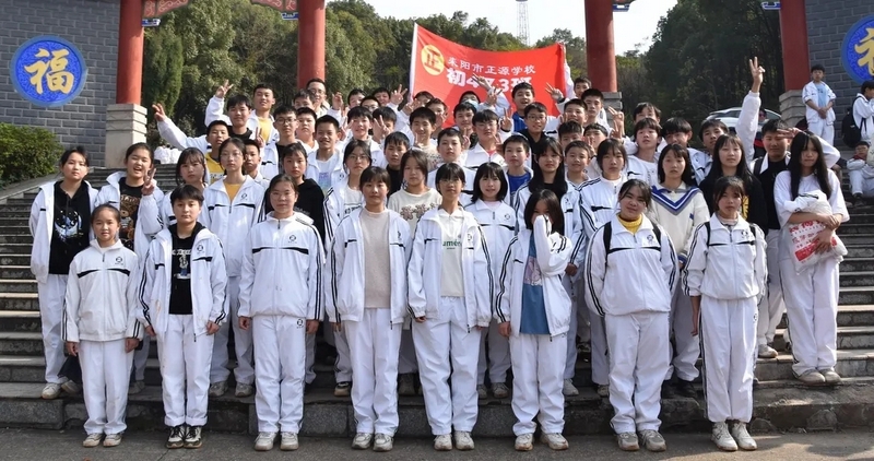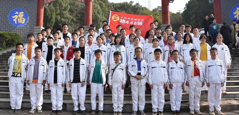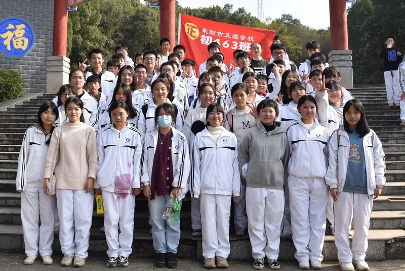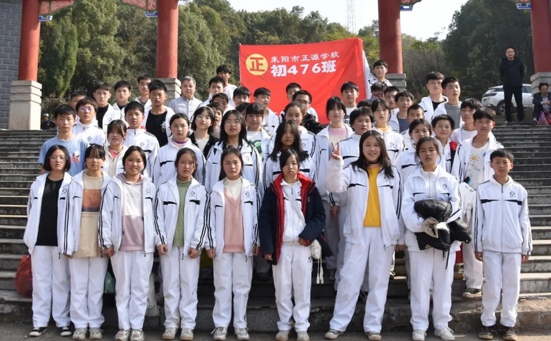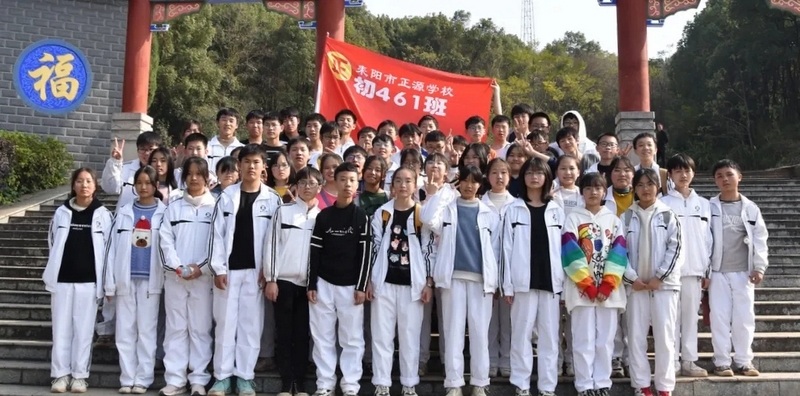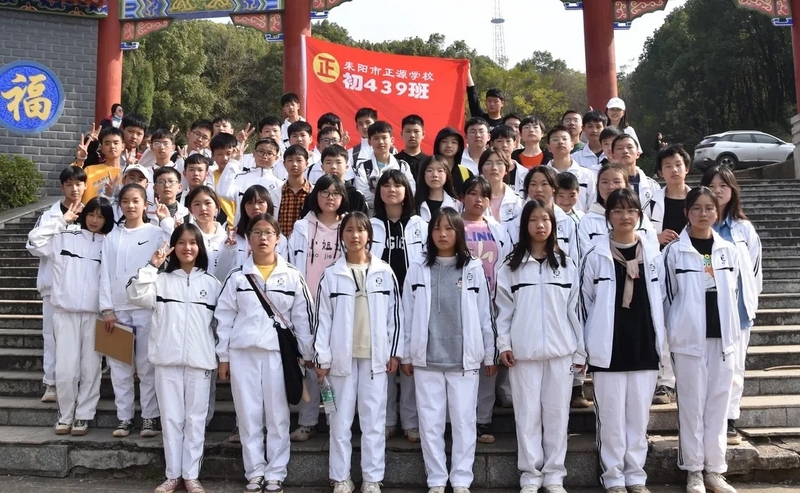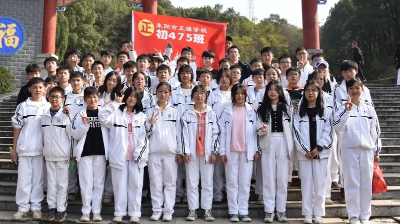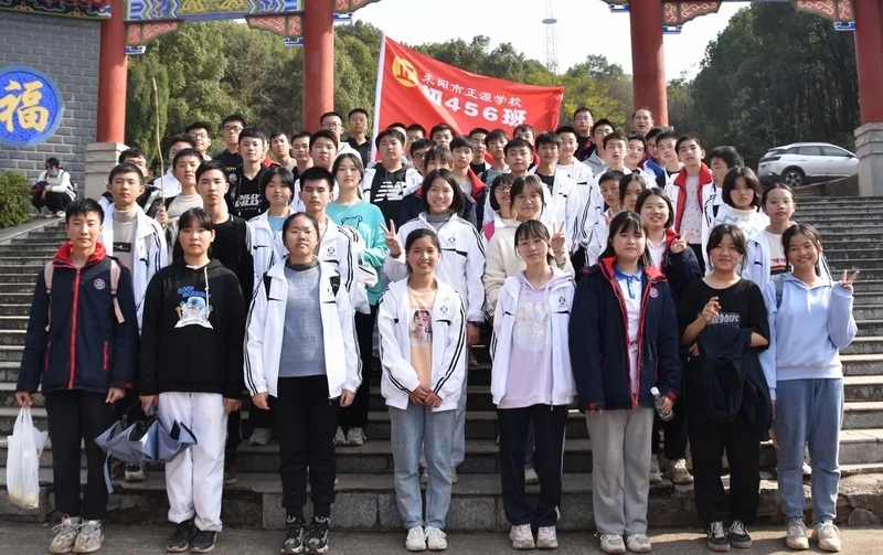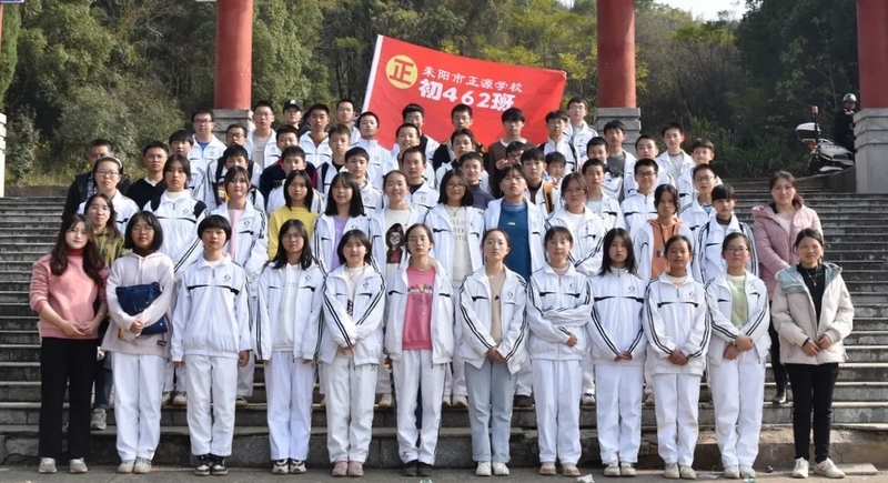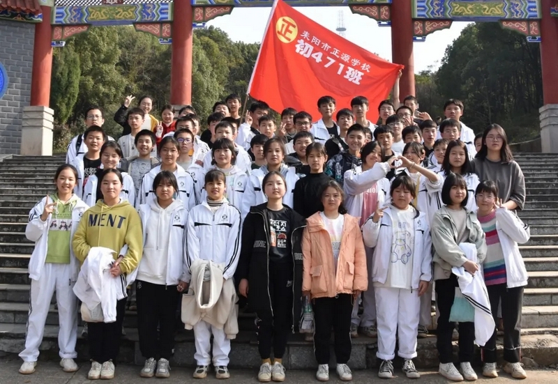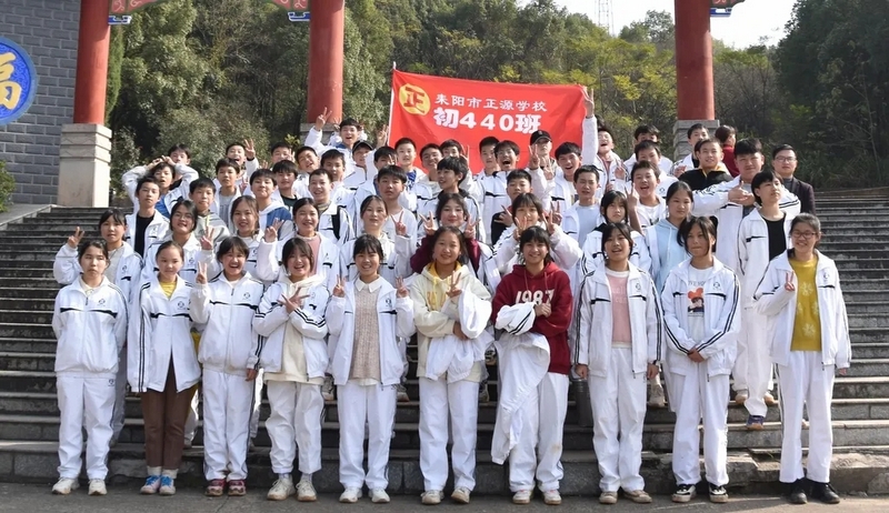 随后罗校长带领全体师生歌唱《海阔天空》、《我和我的祖国》。歌声里有登上山顶的凌云壮志,有青春张扬的蓬勃,更有正源学子生生不息的活力。合唱完毕,全体师生与校长在大雄宝殿合照留影,记录下美好的回忆。队伍继续向前,直登山顶。会当凌绝顶,一览众山小,从鹿岐峰俯视耒阳,学生们的眼界开阔,心灵也更开阔。