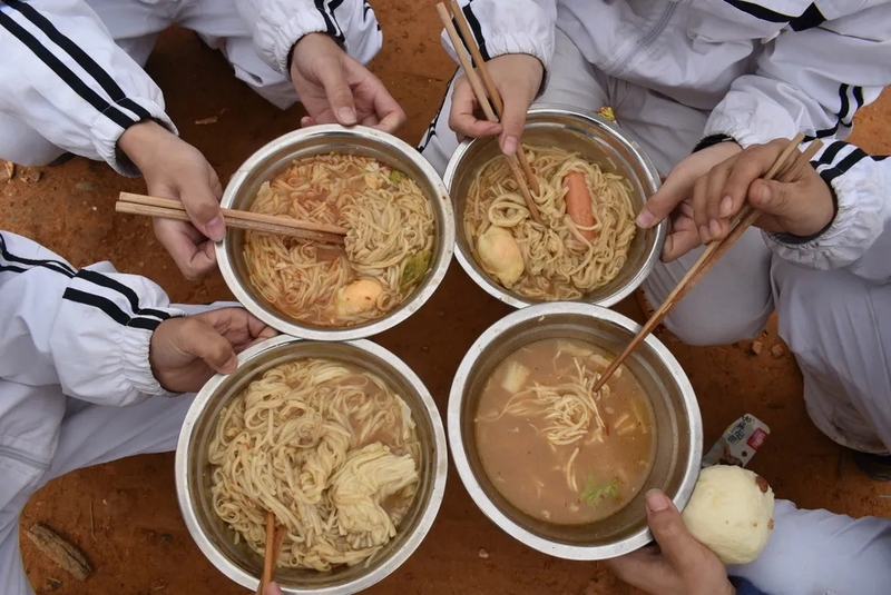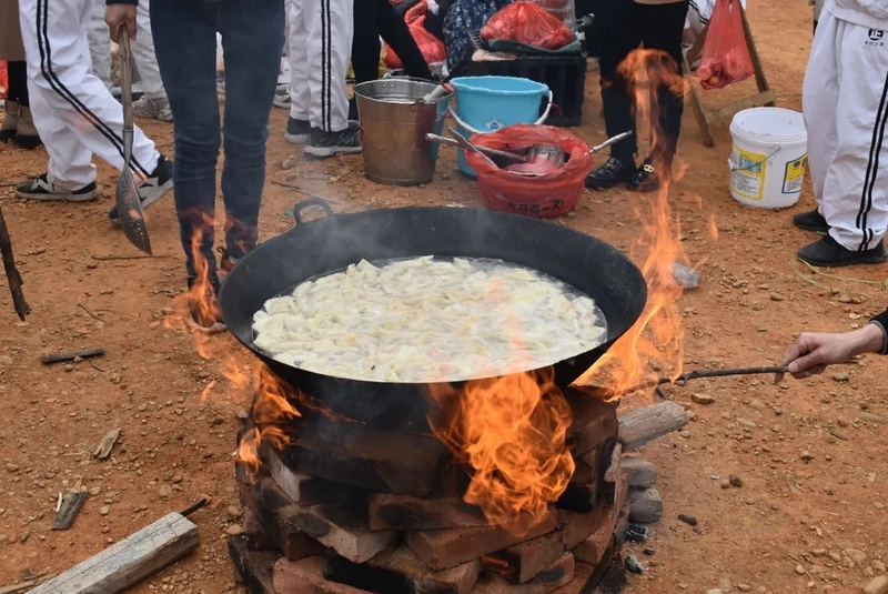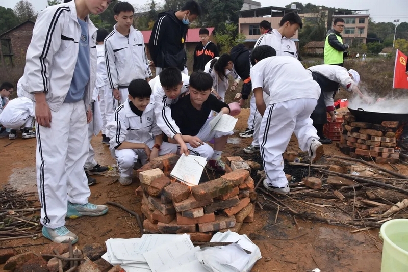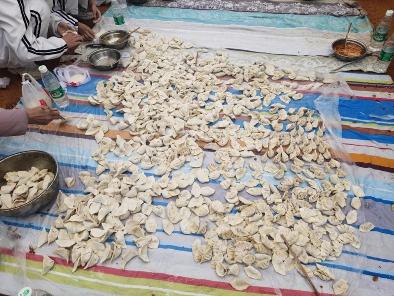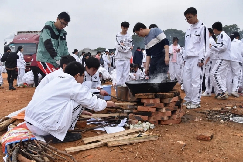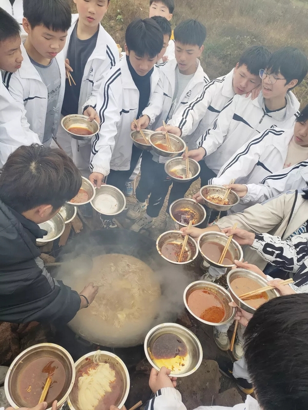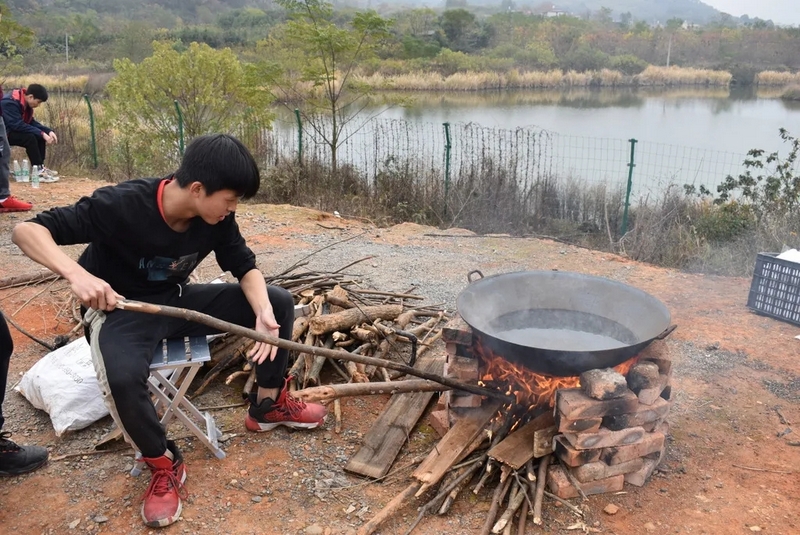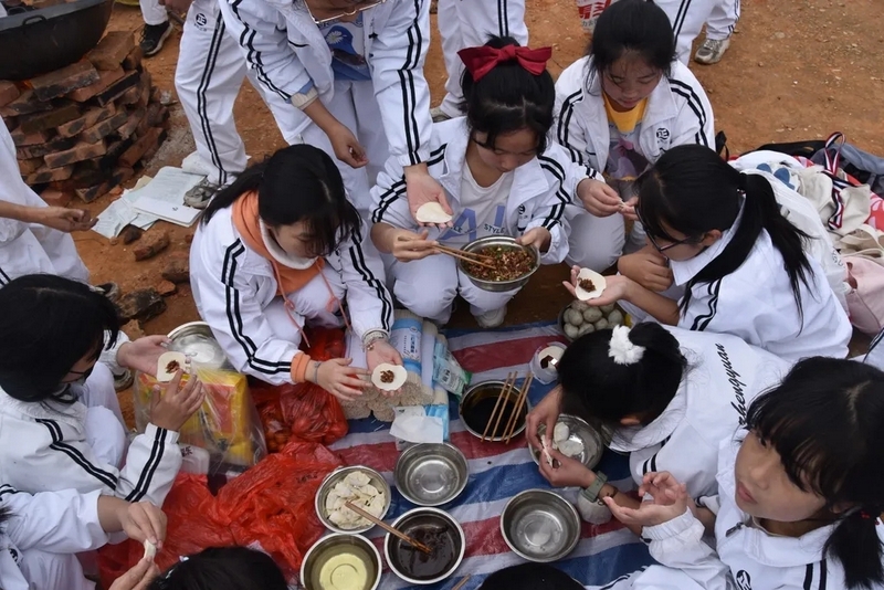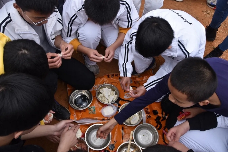 到达山脚下,映入眼帘的是后勤工作人员忙碌的身影,所有物质铺满整个山脚,整个场面蔚为壮观。学校提供了大量的肉类、面条、饺子皮、饺子馅、冬枣、鸭蛋,还有做饭工具:锅碗瓢盆一一俱全。学校还贴心的装了一车水,以保证做饭的需求。孩子们到达野炊地点后,无不欢呼雀跃,以班级为单位,安营扎寨,带班老师带领学生紧张有序地打灶生火。班级学生分为若干个小组,做到了人人有事做,事事有人做,既有分工又有合作。