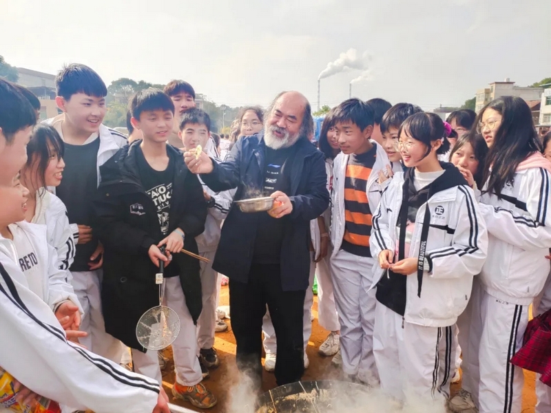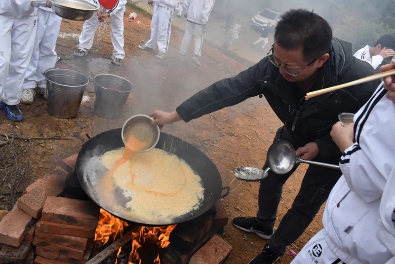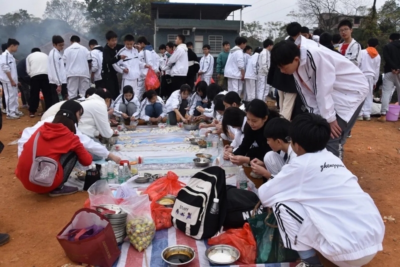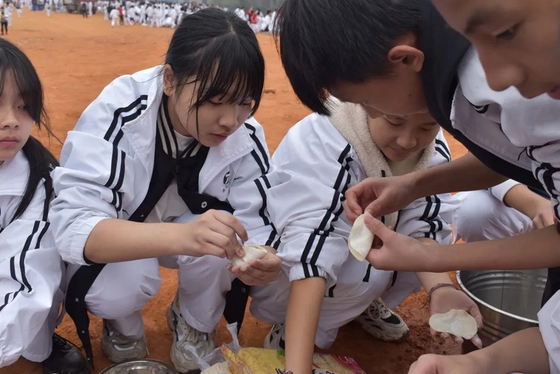 有趣的事在野炊过程中时时发生,全体师生打成一片,顿时山脚下充满欢声笑语。同学们像模像样的包饺子,有包成圆形的、有包成正方形的,只有你想不到,没有他们做不到。一盘盘奇形怪状的的饺子下了锅,顿时香气四溢,孩子们迫不及待的排起队伍等待饺子下肚。一锅空了,下一锅紧接着下,带班老师怕饿着学生们,火急火燎的将食材下进锅中。于是,一顿丰富的午餐就好了,孩子们吃得津津有味。正午艳阳高照,同学们的热情不减,随着温度渐渐高涨。校长的到来更是让欢乐的场面急剧火爆,学生们将罗校长团团围住,争相的将手上有的桔子、苹果、面包、饺子、面条送给校长,并争先恐后的向校长展示自己包的奇形怪状的饺子,还有学生向校长展示自己班搭的灶台,惹的校长哈哈大笑。校长亲切的问候全体师生,并细心的为同学们夹煮好的面条,和孩子们一起品味美味,他慈祥的问孩子们:“饺子好不好吃,面条够不够?”又时而担心小孩子的安全,让孩子们小心柴火,不要摔跤,注意安全。学生的心在冬日也变得暖暖的。有一个小孩子身上沾满了黄泥巴,校长问:“这是怎么回事?”原来是这位同学为班级做贡献的“勋章”,校长不禁为他竖起了大拇指,并称赞他:“你是个有团体意识,为同学服务的好学生。”校长的言行将气氛推入了高潮。全体师生备受鼓舞,和校长共享着欢乐的饕餮盛宴。