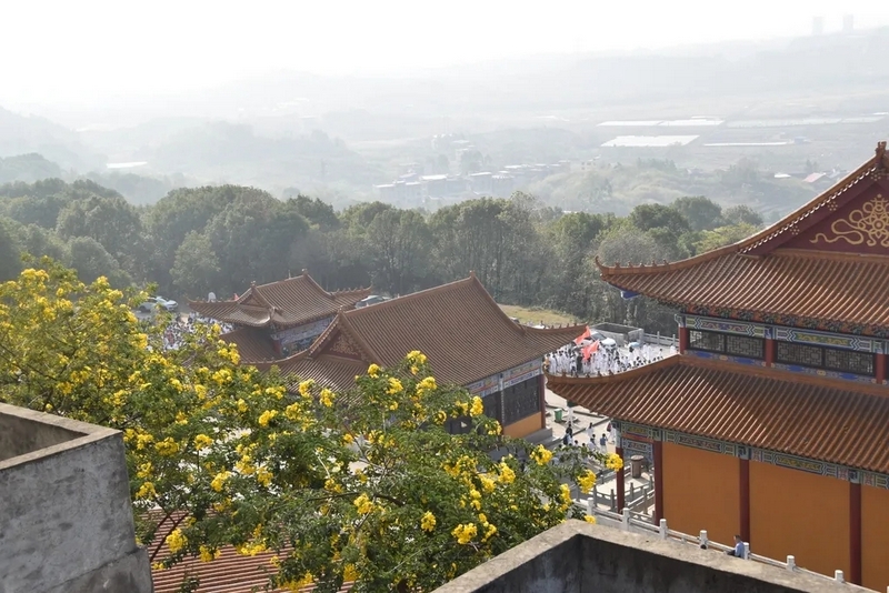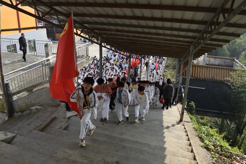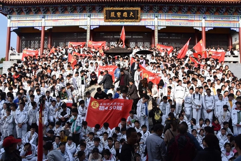 留影后,学生们兴奋至极,队伍一鼓作气,沿着山路蜿蜒盘旋登上了鹿岐峰寺庙的大雄宝殿,2000多名师生,声势浩大,浩浩汤汤。在大雄宝殿前,校长先向同学们表示:初二年级作为我们学校最大的的年级,这一次远足是有重大意义的。一直以来,正源始终秉持“进校即思进取,怕苦莫入正源”的理念,要求学生“文明其精神,野蛮其体魄”,做“敢打敢拼,敢为人先”的正源学生。罗校长还表示:学校组织的远足活动,更是落实国家的双减政策,紧跟时代的步伐,正源始终紧随政策其后。