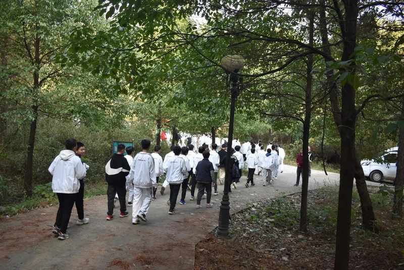 午餐风卷残云过后,全体师生继续重整队伍向山顶出发。途径鹿岐峰入口处,茂密的树木惹人驻足停留,学校早已洞悉了同学们的小心思,便派专门的摄影老师在鹿岐峰牌坊下为每一个班级单独拍合照留影。