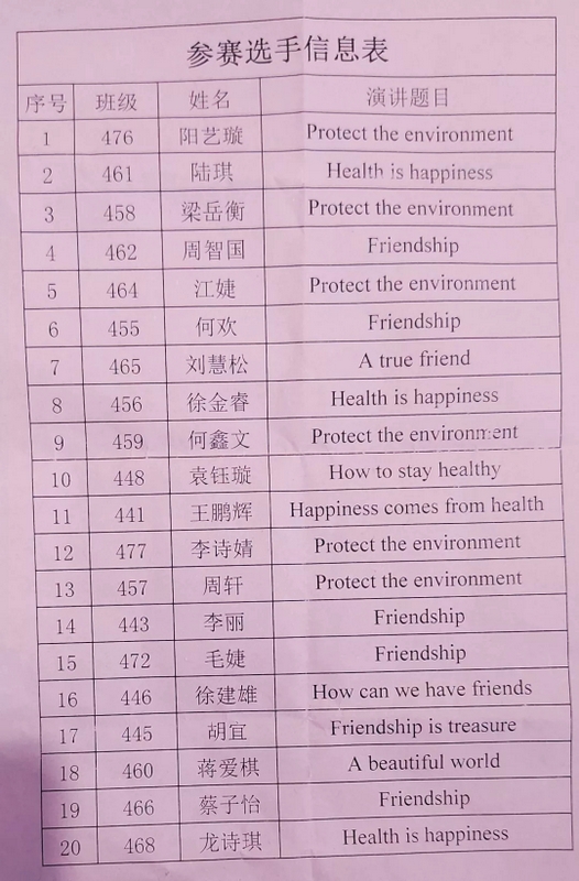 比赛中,选手们用优美的发音,流畅的表达,声情并茂地讲述着友谊、健康和保护环境的重要性。选手们演讲内容丰富,语言优美,有的选手心潮澎湃、慷慨激昂,有的款款叙述、娓娓道来,各具风采。选手们的精彩演讲获得了评委老师们的一致好评,赢得了同学们的热烈掌声。有心的观众还为自己喜欢的选手设计了加油口号并制作了精美海报。
