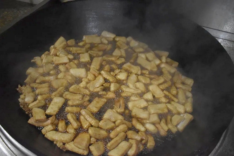 油豆腐,还是用乡村收购的本地小黄豆做出来的豆腐,还是用自榨的菜籽油煎炸而成,却是市面上有钱也买不到的香甜。