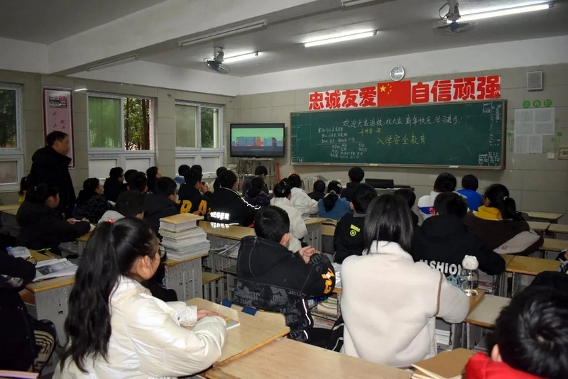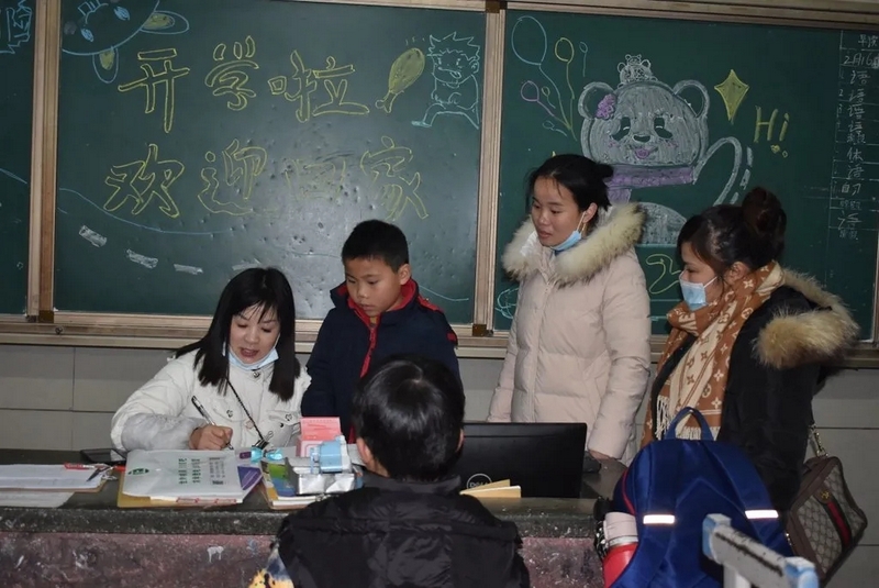教室里,班主任老师正笑容可掬地守候在讲台边迎接同学们的到来;黑板上,“开学啦!欢迎同学们回家!”等问候语和老师们别出心裁的粉笔画正欢快地跟同学们招手。