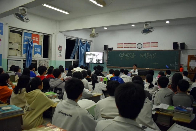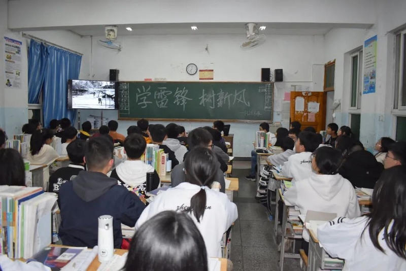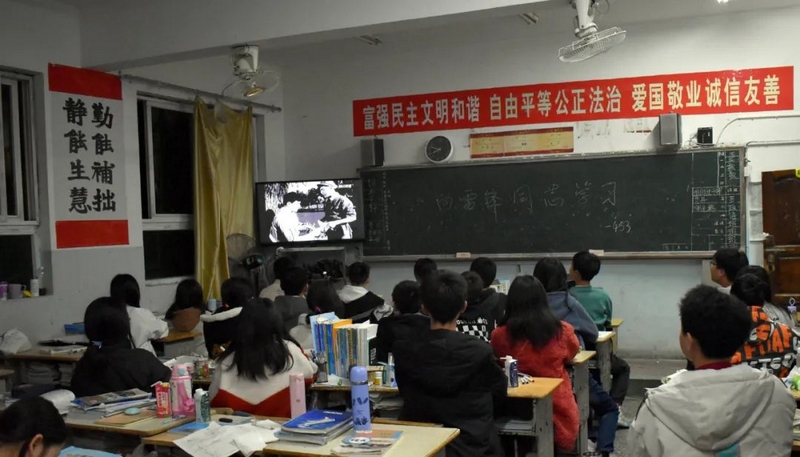 晚自习期间,全校师生在教室观看经典教育影片《雷锋》,感受、学习雷锋从身边的小事做起,不为名利、不计个人得失,把一切出发点都围绕在党和国家、人民的利益上的高尚情怀和人生追求。